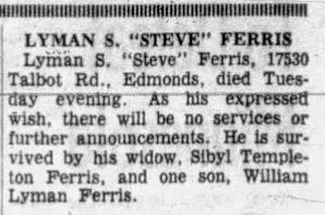 The Seattle Yacht Club in 1926.An older picture of the Seattle Yacht Club courtesy of The Seattle Yacht Club.A second older picture of the Seattle Yacht Club courtesy of The Seattle Yacht Club.The Seattle Yacht Club in April, 2022.The Seattle Yacht Club in April, 2022.The Seattle Yacht Club in April, 2022.The Seattle Yacht Club in April, 2022.The Seattle Yacht Club in April, 2022.The Seattle Yacht Club in April, 2022.The Seattle Yacht Club in April, 2022.The Seattle Yacht Club in April, 2022.The Seattle Yacht Club in April, 2022.The Seattle Yacht Club in April, 2022.The Seattle Yacht Club in April, 2022.Taken by a drain in front of the Seattle Yacht Club in April, 2022.The Seattle Yacht Club in April, 2022.A blurb from a line in a newspaper mentioning that Little Sibyl Templeton broke her right wrist published in The Daily Herald on July 11, 1916.A newspaper clipping about the death of Sibyl Ferris’s husband published in The Daily Herald on November 8, 1961. The couple had a son together named William.The residence of Sybli Ferris, located at 736 NE 56th St in Seattle (I learned this from Detective Kathy McChesney’s case file notes). A portion of Kathy McChesney’s 1972-73 case file notes related to Bundy mentioning Sybil Ferris.A second portion of Kathy McChesney’s 1972-73 case file notes related to Bundy mentioning Sybil Ferris.A third portion of Kathy McChesney’s 1972-73 case file notes related to Bundy mentioning Sybil Ferris.The death certificate of Sibyl Ferris.