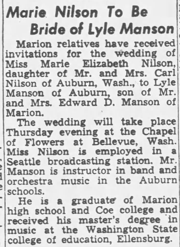 Donna Gail Manson was born on June 9, 1954 to Lyle Edward and Marie Elizabeth (nee Nilson) Manson in Olympia, WA. Mr. Manson was born on August 29, 1917 in Marion, Iowa and Mrs. Manson was born on May 9, 1923 in Auburn, WA. The couple were wed on December 4, 1952 and had two children together: Donna and her younger brother, James. An eagle scout and troop leader, Mr. Manson served in the Navy during World War II (he was a Pearl Harbor survivor), and upon returning home he continued with his education and graduated with his BA in music education from Coe College in June 1949; he went on to earn his Masters from Central Washington University in 1952 (which is the same college Susan Rancourt was abducted from), and after graduating he got a position as a music teacher for the Seattle school district. Marie Manson graduated from the University of Washington in 1949 with a BA in music education, and worked PT as a legal secretary; she was also the choir director at Auburn First United Methodist. Both Mr. and Mrs. Manson spent two years performing with the Seattle Philharmonic Orchestra.