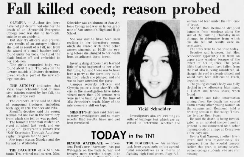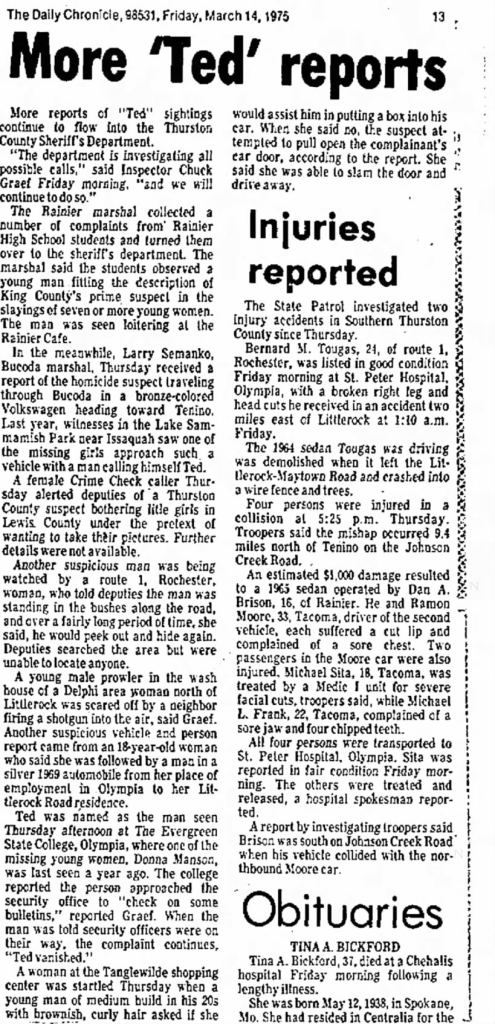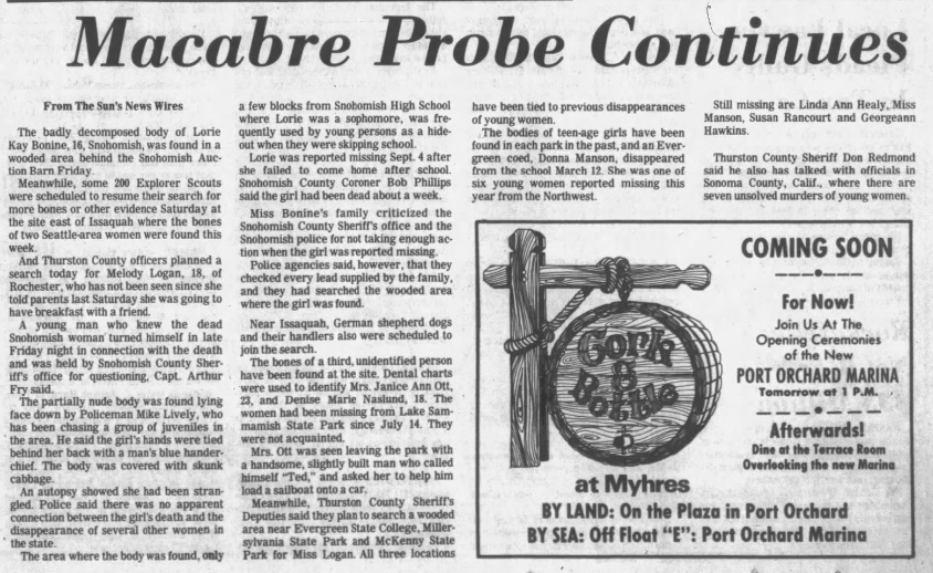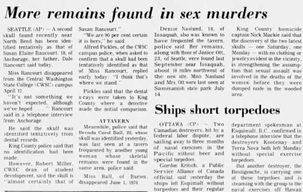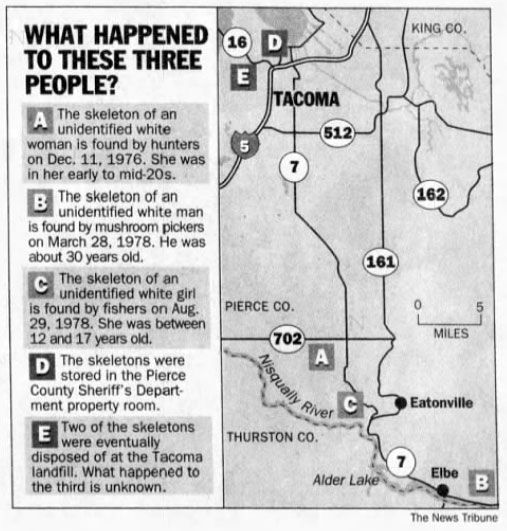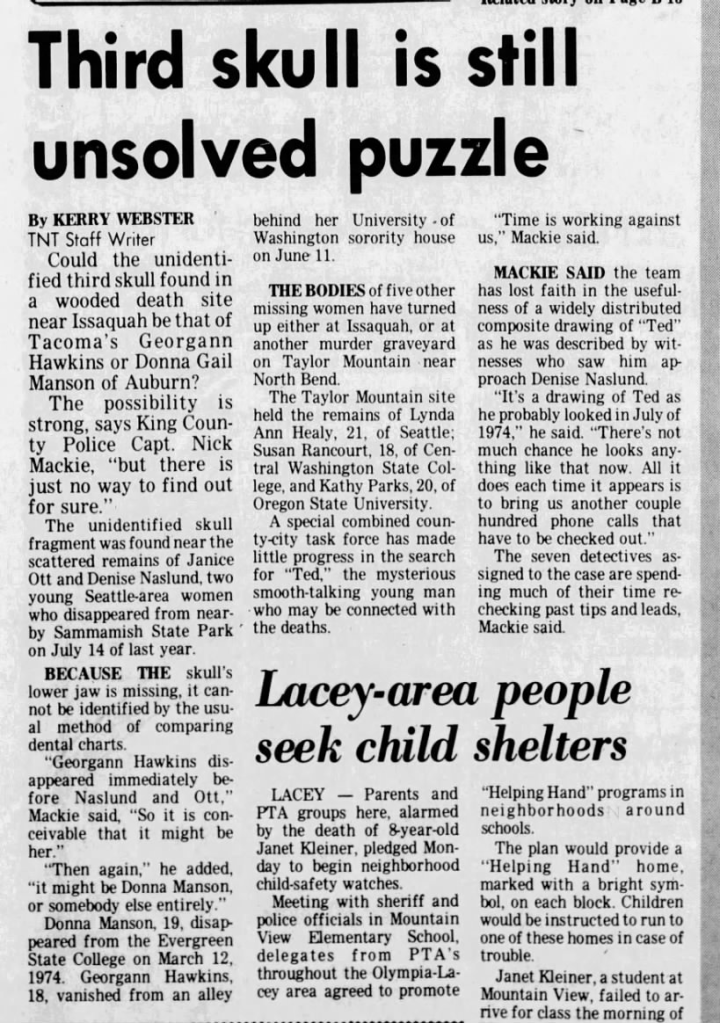 On August 28th, 1978, two fishermen discovered the skeleton of a young female in the foothills of Mount Rainier near Eatonville, about 60 miles away from Bundy’s Taylor Mountain dump site. Despite multiple newspapers reporting that the missing skeleton belonged to Manson, the facts do not seem to line up: ‘The News Tribune’ reported that the skeleton Pierce County sheriffs discovered was 5’7”, and Donna was only 5 feet tall. Also, the remains were discovered wearing blue jeans, where Donna’s roommates said she was wearing a pair of green (or blue) pants the night she disappeared. Investigators also showed photographs of the clothing found on the skeleton to Manson’s parents and her mother was quick to say that she didn’t recognize the top as belonging to her daughter. The report also said the victim was somewhere between 12 and 17 years old where Donna was 19 at the time she disappeared.