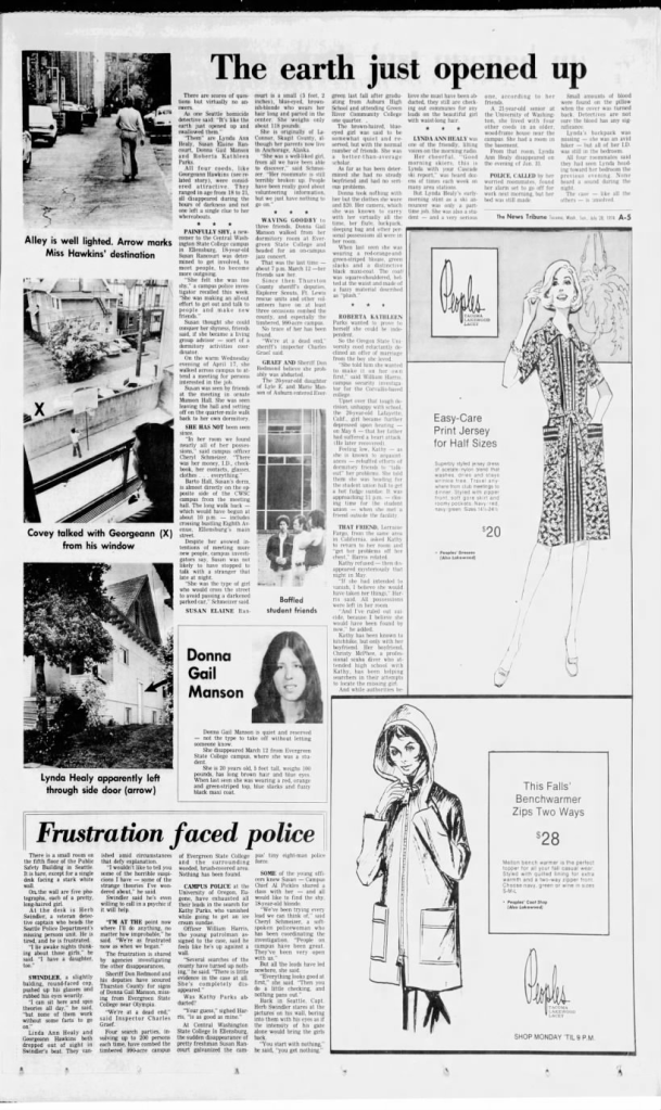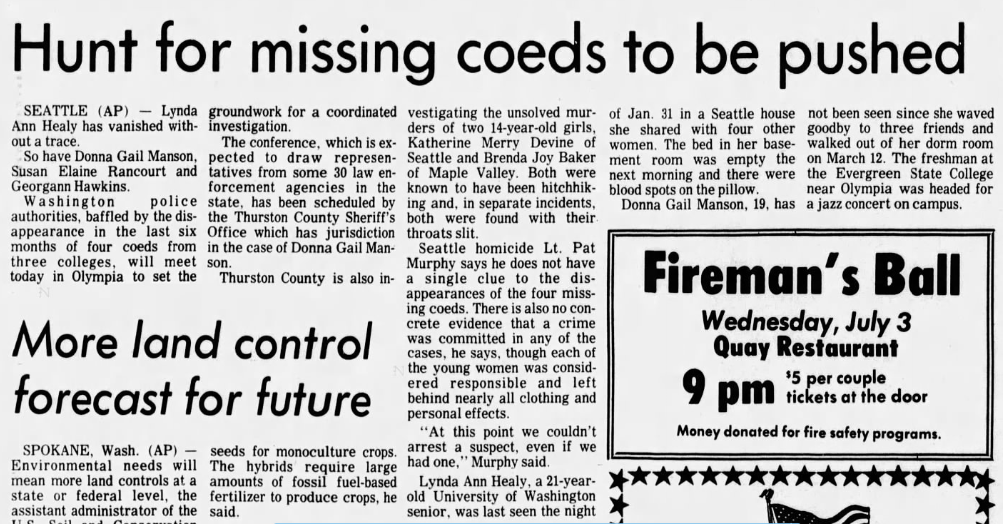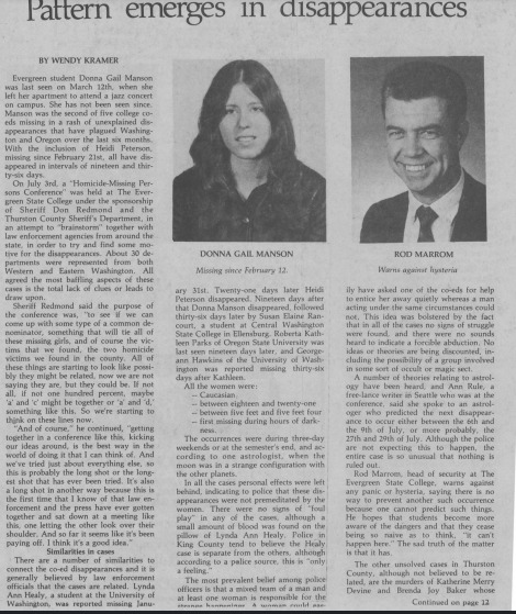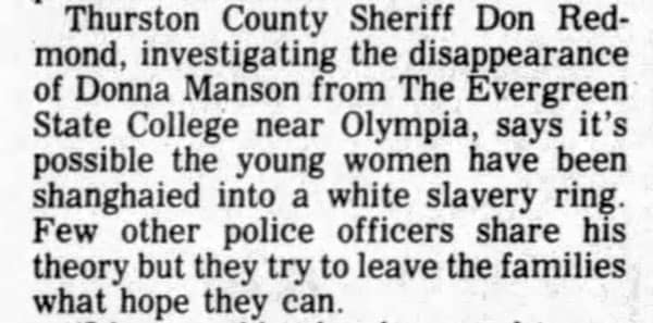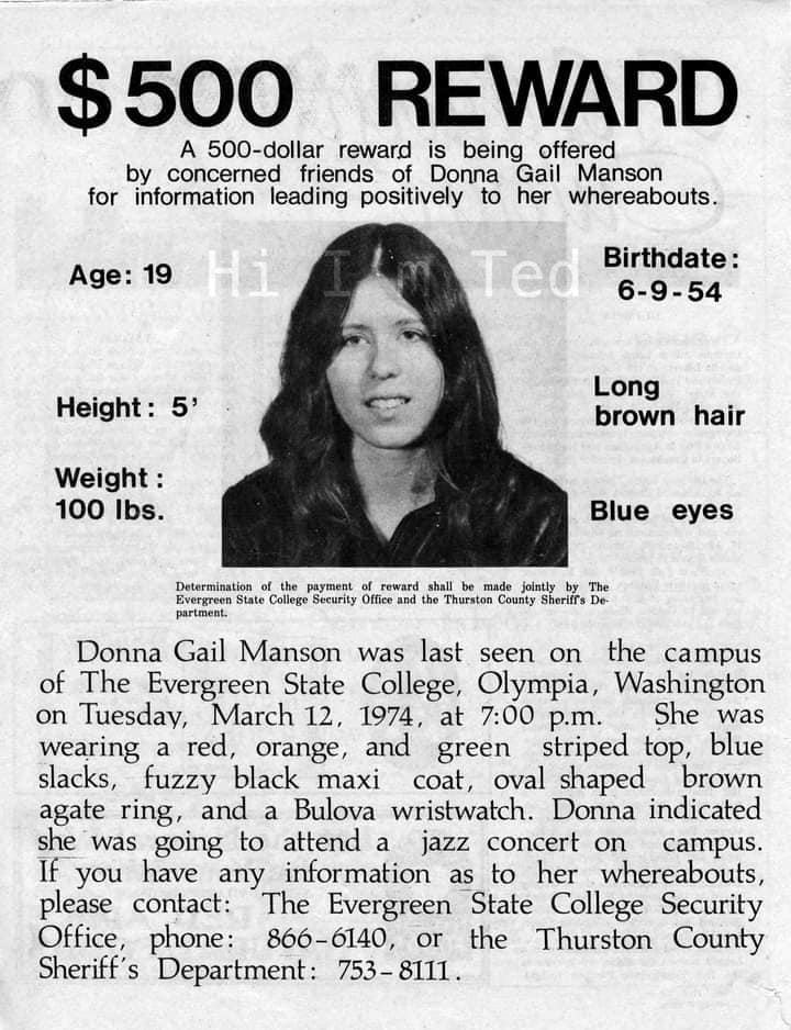 Mostly because Olympia is over an hour away from where Bundy’s other Washington state victims were abducted from, Manson’s case was not immediately connected to the other Seattle disappearances, and it wasn’t until more women started to disappear that it became clear that her case was a part of a much bigger puzzle. There was a (brief) period where (former) Thurston County Sheriff Don Redmond wondered if maybe there was a slavery ring nabbing young women from the area, but this was quickly ruled out. Unfortunately, we will never know exactly what happened to Donna on the evening she disappeared, as there are very few confirmed details regarding her disappearance. Due to the abduction taking place right before spring break detectives were not able to interview many of the eyewitnesses until weeks later, after their memories were dulled by time (maybe if her roommates reported her abduction earlier LE would have stood a chance of getting some worthwhile information).