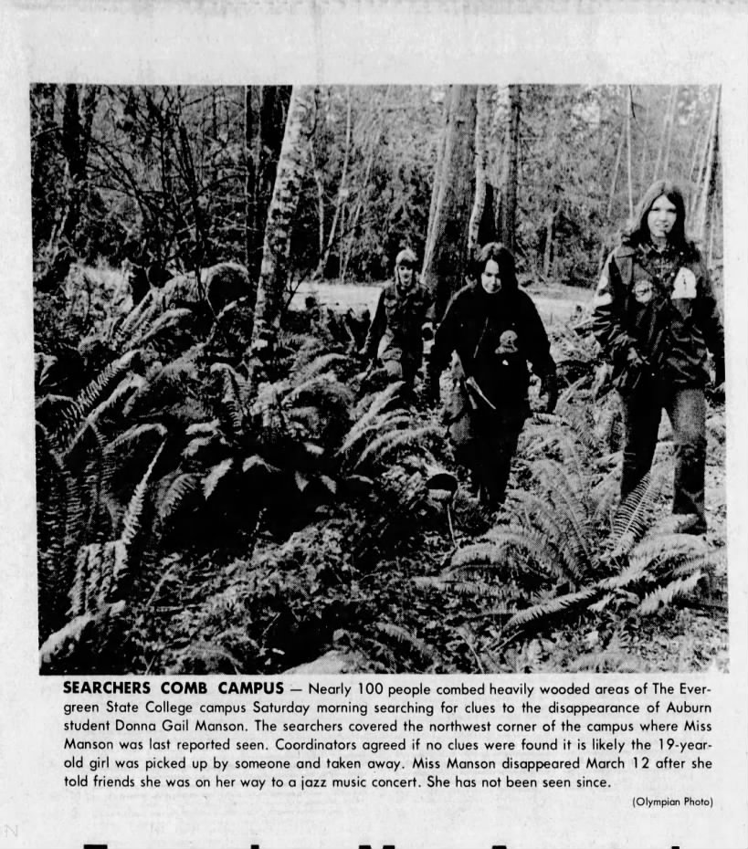 After he got the news that his daughter was missing, Lyle Manson immediately drove to the Evergreen campus to see if he could find out more information about what may have happened to her. When he arrived, Thurston County Detective Paul Barclift tried to reassure him by saying: ‘maybe she just went off somewhere with some boyfriend. That’s the way these things usually turn out around here.’ Manson’s stern Scotsman’s face showed cold disagreement, and in response he said: ‘no, Donna had no need to run away. We’ve always given her freedom.’ He and the detective walked from the parking lot to her residence hall, and together they looked through the items in her bedroom: she had left behind all her clothes, toiletries, and other personal items one would need if leaving for any period of time, and amongst her belongings Mr. Manson found her camera and flute, and it was then that he knew that something was seriously wrong. Following Donna’s disappearance, search teams of up to 200 people combed the 990 acre college campus with the assistance of tracking dogs on four separate occasions, but despite their best efforts not one trace of her was ever recovered: she had literally vanished out of thin air.
