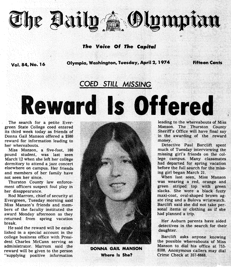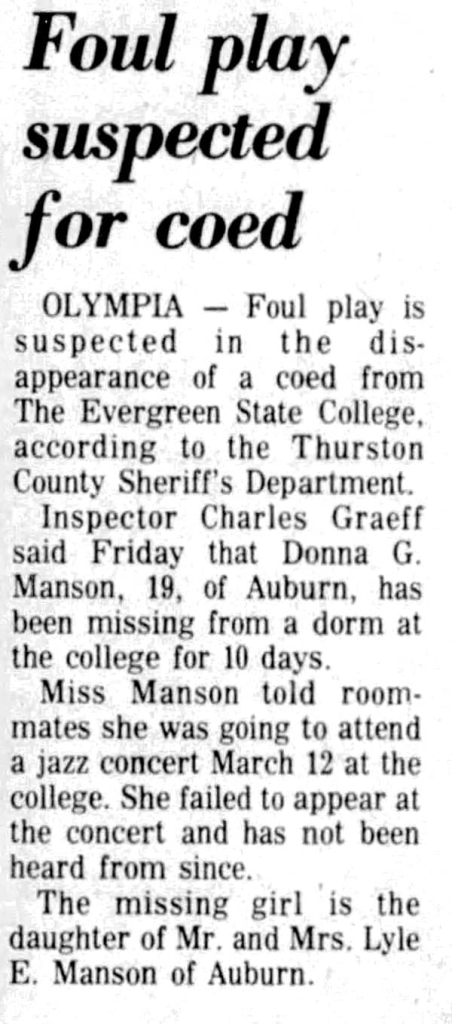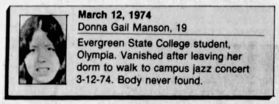 On the day of her abduction, Donna planned on going to a folk dancing class at her schools activities building, and later that same night, she made plans to go to a jazz concert at the Daniel J. Evans Library (which was also on school grounds), which was scheduled to start at 8 PM. She lived in room 206 of the C building on Evergreens campus, and according to her roommates earlier in the evening Donna played her flute a bit and ate some beef vegetable soup (she even left some of it out in a pot on the stove). They also noticed that she seemed unusually focused on her appearance that evening, going so far as to switch outfits several times before eventually settling on a red, orange, and green striped shirt, blue (or green) slacks, a fuzzy black full-length coat (that used to belong to her grandmother), an oval-shaped brown agate ring, and a Bulova Caravell wrist watch. Despite this detail, Manson did not share any details about a date or meet-up with her friends. The night prior to her disappearance Donna spoke with her mother on the phone, and the two discussed her idea of taking a trip to the ocean during her upcoming spring recess. Regarding this, Marie Manson said it sounded like a good idea that they get away for a few days, and despite the ongoing gas shortage of the 70’s said that the family would ‘find a way.’