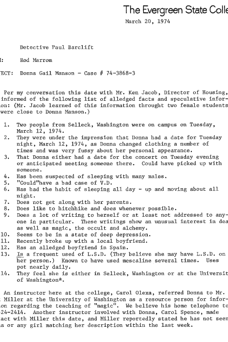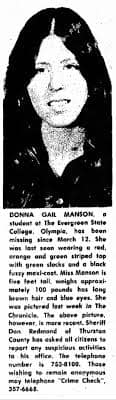 Perhaps it was because of her free spirit and habit of hitchhiking and leaving for days at a time, but when Manson didn’t return home that night no one seemed very alarmed: it took her roommates a full six days to report her missing to the authorities, which is why newspapers didn’t start reporting on her disappearance until March 22, 1974, a full ten days after she was last seen. Several days after her disappearance some local police officers went to the Manson family home in Auburn to tell them that Donna had run away from school, news that made her mother immediately feel uneasy, and she immediately knew that: ‘she hasn’t run away, something’s happened to her.’