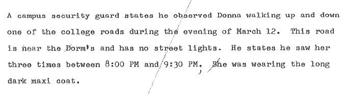 Donna departed her dormitory shortly after 7 PM on March 12, 1974 and set out for the dance class, which should have been just a two minute walk across campus. However, despite how close the College Activities Building was to her dormitory no one recalled seeing her at either the class or the jazz recital, meaning it is highly unlikely that she ever made it that far. She left behind all of her personal effects, money, and clothing.