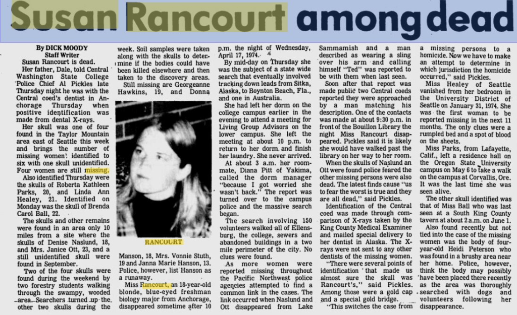 On March 2nd, 1975, two forestry students discovered the skull of Brenda Ball while doing field work over 90 miles away from CWU on Taylor Mountain (or as the locals call it, Tiger Mountain)… a day later, King County detective Robert Keppel was combing the area when he fell over a branch and stumbled across the skull of Susan Rancourt. After this gruesome discovery, it immediately became clear to law enforcement that they were dealing with another one of “Ted’s” dump sites: six months prior (and only 12 miles away), two grouse hunters discovered Ted’s Issaquah dump site.