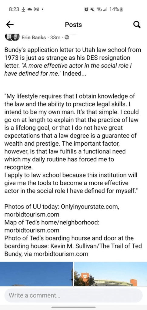 Ted Bundy: Application to law school in Utah. July 25, 2022July 25, 2022 ~ Another Bundy Blog. This is worth a read, it’s Teds application to law school in Utah and its really strange. Thanks Erin Banks! Share this: Click to share on X (Opens in new window) X Click to share on Facebook (Opens in new window) Facebook Like Loading... Related
