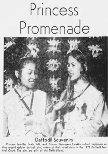 Despite her health challenges, Georgann went on to become a star athlete at Lakes High School in Lakewood, Washington: she was on the swim team in her early years but eventually gravitated towards cheerleading, winning numerous medals and competitions while on her high schools cheerleading squad (where she cheered all four years). In addition to her impressive athletic accomplishments, Hawkins was also a straight A student throughout the entirety of her academic career. During her senior year in 1973, Georgann was awarded with the title of princess to the royal court of the annual Washington Daffodil Festival. As Daffodil Princess, she traveled around Washington State with the other court members and their ‘duties’ involved being interviewed by newspapers, meeting children, riding in parades, attending concerts, and signing autographs at charity events. Georgann even gave a speech in the spring of 1973 addressing lawmakers at the Washington State Legislature.