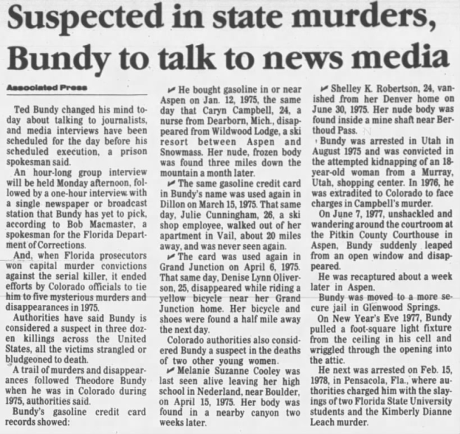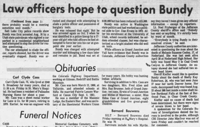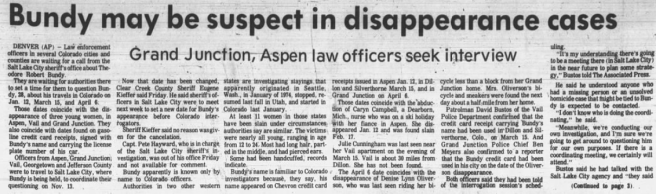 Part two of an article about Ted that mentions Melanie Cooley that was published in the Daily Sentinel on November 1, 1975.