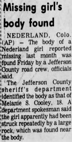 On Friday, May 2, 1975 the body of Melanie Suzanne Cooley was discovered fully clothed and frozen by a maintenance worker on Twin Spruce Road near Coal Creek Canyon about 20 miles away from where she was last seen. Of the discovery, Jefferson County Sheriff Brad Leach said: ‘she had been bludgeoned, perhaps with a stone. Her hands were tied in front with a yellow nylon cord; many, many feet of it, wrapped around and around. She died from a blow to the head and strangulation. Her face had been beaten repeatedly with a rock … One contact lens was missing. The body was in pretty bad shape. What with freezing and thawing, and the wild things, two weeks lying there.’  … ‘Her body, fully clothed, was found by the driver of a bulldozer on a little mountain track up Coal Creek called Twin Spruce Road, a few miles from where the billfold and pill case were recovered. The body was frozen.‘ It was far worse than anything the Cooley family could have dreamed of. Of her big sisters death, little Michelle said: ‘Suzi always said she wanted to be free. And now she’s free!‘ Despite that innocent statement the young child quickly developed nightmares about her siblings death and struggled with them for many years.