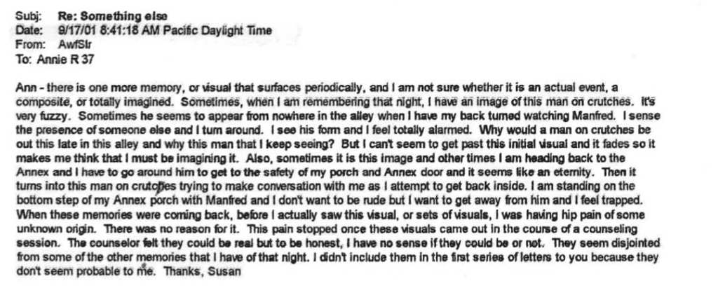 In a letter to Kathleen O’Toole, Survivor started out by apologizing for being so ’emotional and disorganized,’ and that she can’t help it: ‘I am a professional writer and I work from home due to the trauma of what happened to me decades ago and I am organized in most aspects of my life but I struggle still to this day in trying to communicate all that happened and why it’s relevant. There has been a cover up of the Ted Bundy cases in general and in particular relative to the findings at Taylor Mountain. Victims were left behind and never investigated and evidence at the crime scene of both Issaquah ad Taylor Mountain was not protected. People were allowed to profit from the case and too much information was released and other evidence was simply lost, destroyed and discounted.’ Common sense should tell you (plus it’s still widely discussed in the true crime community) that law enforcement is still looking to solve all unsolved Ted-related cases and put them to bed. Despite this, Survivor claims that for over 14 years they refused to investigate any of her claims (that they admitted to her anyways, remember how police were still investigating Bundy despite telling Liz they cleared him?), acknowledge her as a victim (or even talk to her), or even assign her a case number. It is worth noting that people in general have trouble remembering events that happened a long time ago (I think I’ve said that in my last few articles when discussing Bundy’s family attempting to answer questions about Teds activities as a youth). Ms. Survivor heavily implies that Ann Rule helped plant false memories into her head and that was why she gave contradictory statements and false memories (which could be why she pulled her book from publication and is rewriting parts of it); I am including some screen shots of these emails below (Banks, 80).
