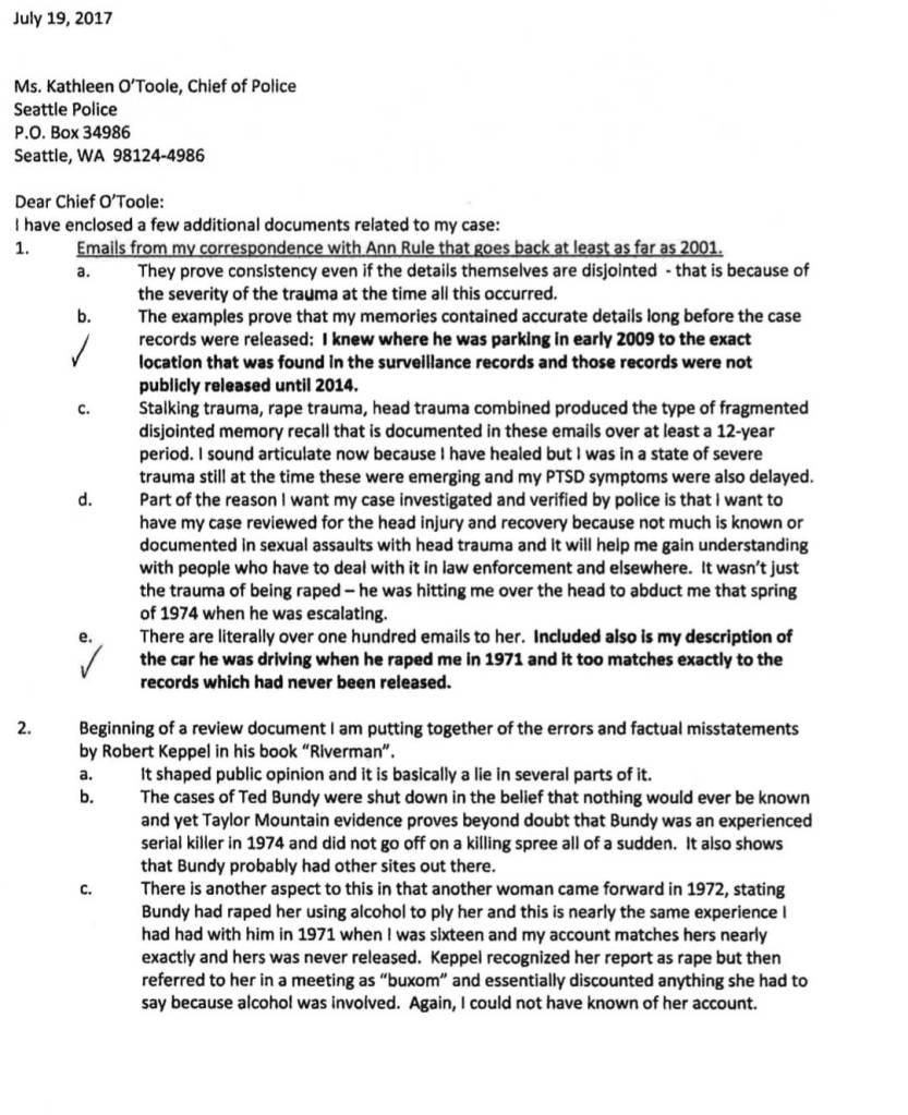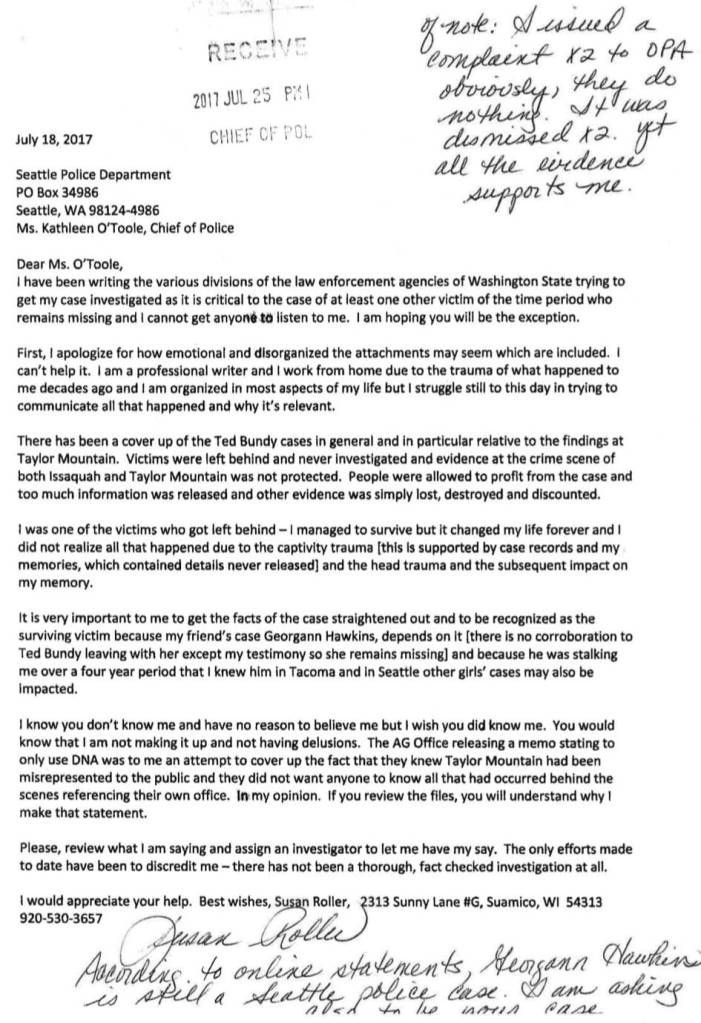 The tl;dr version of Ms. Survivors story is (whose real name is easily found in police documents so the need to publish under a pseudonym doesn’t make any sense): she is a surviving victim of Ted Bundy and over a four year period while in high school and college he repeatedly stalked, kidnapped, and sexually assaulted her. Survivor further claims that Seattle based law enforcement purposefully left out evidence in Bundy related reports (specifically related to the Taylor Mountain dump site), and even goes so far as to suggest there were additional victims that law enforcement refuses to investigate or even acknowledge. In a letter written to former Seattle Police Chief Kathleen O’Toole dated July 18, 2017, Survivor said that ‘there has been a cover up of the Ted Bundy cases in general and in particular relative to the findings at Taylor Mountain. Victims were left behind and never investigated and evidence at the crime scene of both Issaquah and Taylor Mountain are not protected. People were allowed to profit from the case and too much information was released and other evidence was simply lost, destroyed and discounted.’