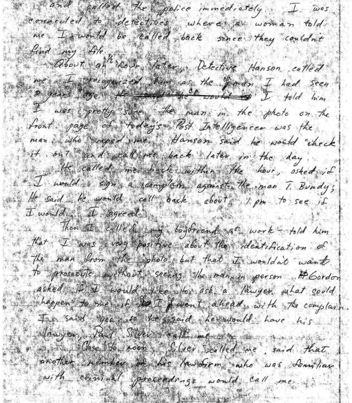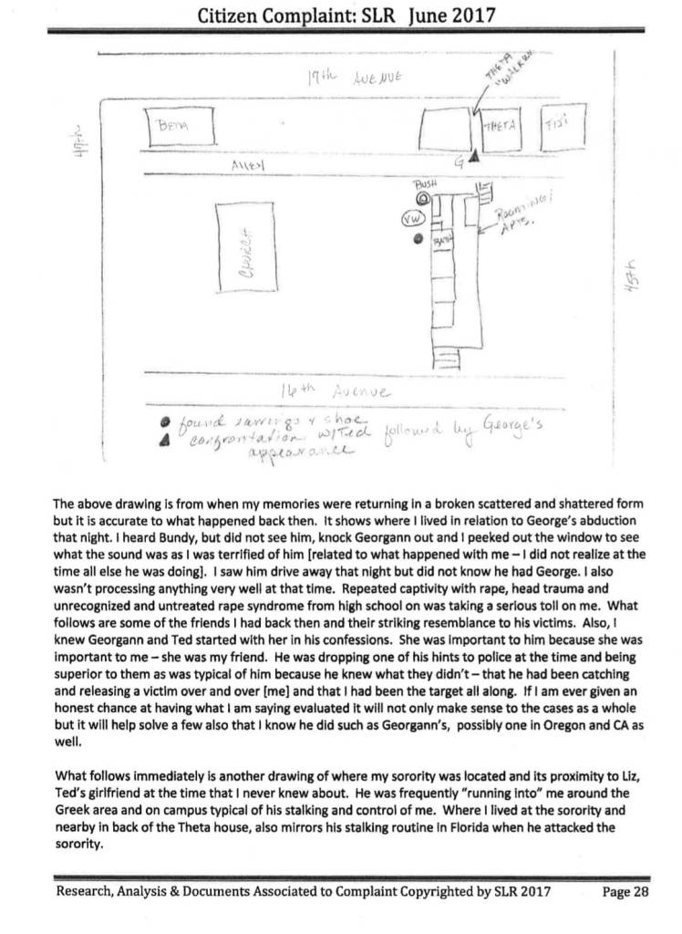 As I said earlier, Ms. Survivor claims that Bundy stalked and followed her while in school (both at Clover Park High School in Tacoma and the University of Washington), even going so far as to follow her when she traveled for modeling jobs throughout the western part of Washington state and beyond… she said that wherever she went, Bundy was there, waiting… but WHY? And how? I hopefully don’t need to say this took place way before the days of social media. Yes, I definitely think Bundy stalked his prey before he went in for the kill but how did he track her from states away? Logically, it makes absolutely no sense and timewise… how would he have been able to pull something that time consuming off and not have anyone notice this incredibly erratic behavior? Survivor claimed that what Bundy did to her back in the 1970’s is still being looked into by law enforcement. On page 28 of ‘Citizens Complaint: SLR June 2017, ‘if I am ever given an honest chance at having what I am saying evaluated it will not only make sense to the cases as a while but it will help solve a few also that I know he did such as Georgann’s, possibly one in Oregon and CA as well.’