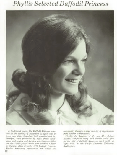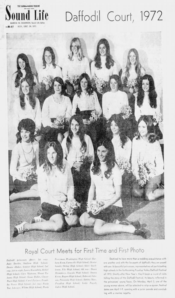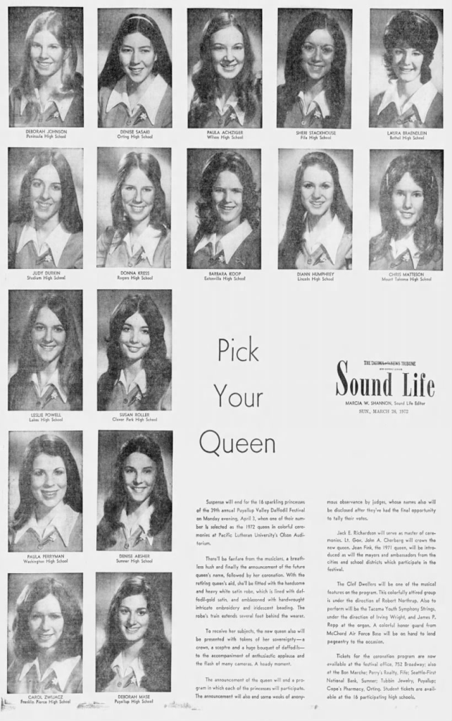 From page 28 of ‘Citizens Complaint: SLR June 2017’: ‘also, I know Georgann and Ted started with her in his confessions. She was important to him because she was important to me: she was my friend. He was dropping one of his hints to police at the time and being superior to them as was typical of him because he knew what they didn’t: that he had been catching and releasing a victim over and over (me) and that I had been the target all along.’ I mean, this just sounds like the ramblings of a person suffering from delusions: why wouldn’t he just talk about Roller? Why would he be so insistent on keeping his relationship with her a secret? If I can be completely honest, I was almost ready to completely write off Ms. Survivors claims that she knew Georgann Hawkins in any sort of capacity. And where I couldn’t find actual proof of their friendship I did discover that Sara was a Daffodil Princess in 1972… It’s fairly common knowledge in the Bundy community that Georgann was Pierce County’s Daffodil Princess the following year in 1973… now, I scoured the internet to find any pictures/videos of them together and came up with absolutely nothing. Perhaps this isn’t the groundbreaking proof I originally thought it was, however it does make me wonder if they were at the very least acquaintances through events with the flower bulb business. It definitely makes me wonder…