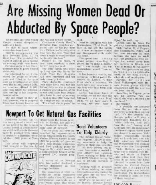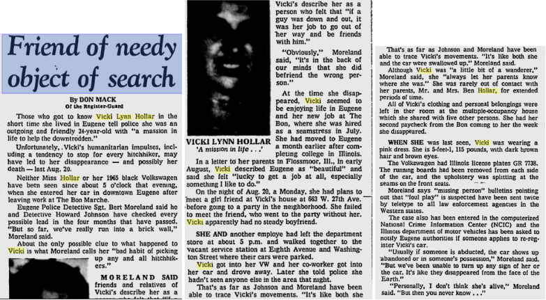 Vicki’s family stated she was incredibly content with where she was in her life and was happy with the direction it was heading: she loved her new job, had a lot of friends and didn’t seem to have any reason to just up and leave. Like so many others in the 1970’s, she did have a habit of picking up hitchhikers on occasion. Described as ‘outgoing and friendly,’ the young woman was said to ‘have a mission in life to help the downtrodden,’ and an officer that worked the case said that loved ones described Vicki as a kind-hearted person who felt that ‘if a guy was down and out, it was her job to go out of her way to be friends with him. Obviously, it’s in the back of our minds that she did befriend the wrong person. On December 14, 1973 a story that ran in the Register-Guard said ‘unfortunately, Vicki’s humanitarian impulses, including a tendency to stop for every hitchhiker, may have lead to her disappearance but that so far the investigation had run into a brick wall.‘