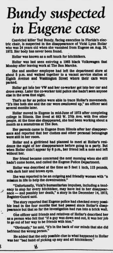 I’ve been finding most of Bundy’s ‘unconfirmed victims‘ have very weak commonalities without a lot of substance… Vicki did look like one of Teds victims: she was beautiful and slim, with brown hair and dark features. Her abduction was most likely a crime of opportunity, like so many of the others. Additionally, she fit neatly into his age range, as he killed young females anywhere from 12 years old (possibly even as young as eight if you throw Ann Marie Burr into the mix) up to 26 years old (ski instructor Julie Cunningham). But that’s about it. Bundy confessed to two homicides in Oregon but never gave any information that would identify the victims. It’s highly considered that Hollar is one of those two girls. Ted confessed to abducting Roberta Kathleen Parks from Oregon State University on May 6, 1974; he claimed to have raped and killed her at Taylor Mountain, over 250 miles away from the school and about 25 miles southeast of Seattle. Because she was found in Washington, she is not included in his Oregon victim count. In interviews with law enforcement, Ted confessed to killing two additional women in Oregon but refused to elaborate on their details; Vicki Hollar and Rita Jolly are the best candidates according to most law enforcement. Oregon detectives tried but were unable to question Ted regarding Vicki’s disappearance before his execution in 1989, eliminating the chance of closing the case in relation to Bundy. I was not able to find anything from any of Ms. Hollar’s family in regards to Bundy as her killer, however I did find a quote by Jill Jolly that was of importance: ‘as I recall, my mother told me that the local detectives managed to get a direct question about Rita through to him before his execution, and his reply was ‘No. No more in Oregon.’ Bundy withheld many secrets hoping to parlay the untold stories into yet another stay of execution. ‘There are other buried remains in Colorado’ he said, refusing to elaborate any further. Dubbed Ted’s ‘bones-for-time scheme,’ this only frustrated detectives even more.