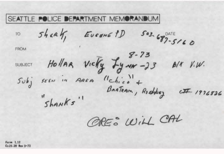 It’s strongly theorized that after her workday Vicki was on her way to her apartment about 1.7 miles away located in the 6600 block of West 27th Avenue. She was supposed to meet a friend at her place around 8:00 PM and from there the pair were going to go to a party somewhere in the neighborhood. Unfortunately, Vicki never made it home or to the gathering, and sadly was seen or heard from again. The friend she was supposed to meet up with hung around for a little bit then when she never showed up, left a note for Vicki and went to the party by herself. The next day however, when she still didn’t hear from Ms. Hollar the friend became even more concerned, and because Vicki was a bit older than the other missing girls vanishing around the region law enforcement immediately took her disappearance seriously: she was establishing roots in Eugene and didn’t seem to have any reason to just up and leave.