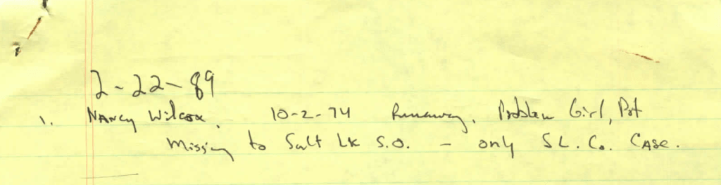 From January to July 1974, young women in Washington state were disappearing at an alarming rate, and even though most residents of Utah were somewhat aware of what was happening it still seemed too far away to really affect them. After all, it was Seattle’s problem, not theirs. At the time in the mid-70’s, law enforcement felt so strongly that the killer was going after young coeds in the general Seattle area that they were even hesitant to link ‘Ted’ to the disappearance of Kathy Parks out of Corvallis, Oregon. I probably don’t need to say that Nancy was the first of many young women to vanish without a trace from the Salt Lake City area in 1974. The juvenile division of the sheriff’s department did not release a public appeal for information related to her disappearance until December of 1974, three months after she vanished (and even then they stressed that she ‘might still be a runaway’). On the day after Ms. WIlcox’s case first made the news a waitress from Lake Point contacted the Sheriff’s Department and told them she had seen a girl matching Wilcox’s description at the restaurant where she worked. She further claimed that the young girl was with a ‘tall young man who had a mustache’ and when they were done with their meal drove off in a ‘light-colored Volkswagen.’