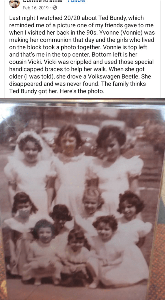 At this point in my writing I don’t need to point out that this attractive young woman fits the physical description of Teds other victims and he was known to have been in the general region at the time of her disappearance. At first I thought 24 was a little too old to make her one of Teds victims (as I previously stated, Julie Cunningham was 26 when she was killed)… then I remember this one time when I went back to school for my counseling degree (what a total waste of time that was): all the kids I was taking classes with were all in their very early 20’s and in between classes one day we were all sitting around talking and when I told them I was 30 they all seemed genuinely surprised that I wasn’t ‘their age’ (their words, not mine I swear). I mean, maybe they were being kind but I’ve been told my entire life I look younger than I am. Maybe not SUPER young but maybe Vicki looked younger than she was. Or maybe I’m overthinking this and 24 was a fine age for Bundy. Just my thoughts.