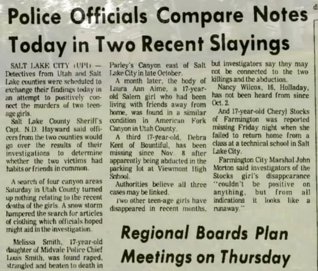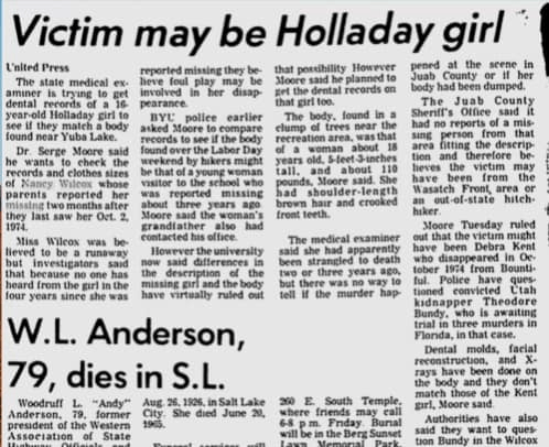 On September 2nd, 1974 Bundy left Washington and moved to Salt Lake City to attend the University of Utah School of Law. After Nancy’s mysterious disappearance on October 18, 1974, he abducted 17-year-old Melissa Smith from Midvale, Utah; her naked body was discovered nine days later by two deer hunters on a hillside in Summit Park, UT. A stocking was found tied around her neck and she had sustained multiple blows to the head. Less than two weeks later on the evening of October 31, 1974, 17-year-old Laura Ann Aime vanished after leaving a cafe in Lehi, Utah. Almost a month later on November 27th two hikers stumbled upon her remains in American Fork Canyon. A little over a week later on November 8, 1974, Bundy attempted to kidnap 18-year-old Carol DaRonch from the Fashion Place Mall on South State Street in Murray but was unsuccessful. After DaRonch escaped, Bundy quickly realized he’d need a new victim and drove roughly 25 miles away to Bountiful to abduct 17 year-old Debra Kent. Kent and her parents were at a play at Viewmont High School when it went later than expected. She volunteered to take the family car and pick up her two younger brothers at a nearby roller skating rink. On her way out to the parking lot, Bundy abducted then killed her and dumped her body roughly 50 miles away in American Fork Canyon. Upon realizing that a worrying pattern was emerging, the Salt Lake County Sheriff’s Office began a review of all their cases involving missing girls. Subsequently, they determined that Nancy Wilcox and Debra Kent were the only girls who were still unaccounted for.