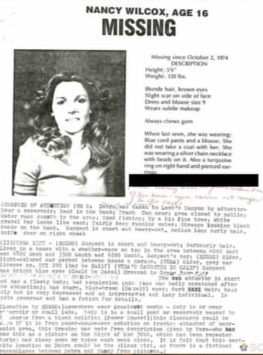 Nancy Wilcox was born on July 4, 1958 to Herbert and Constance (nee Mouritsen) Wilcox of Holladay, Utah; she was one of six kids and had four brothers and a sister (David Michael, Richard Stephen, Thomas Brent, James Patrick and Susie Wilcox-Nelson). The Wilcox family were devout Latter-day Saint’s and Nancy was very active in the LDS community; she was described as being incredibly kind, very pretty, funny, and it seemed that everyone who knew her liked her. She was said to have a small, close-knit group of friends, was a straight shooter, and didn’t drink, do drugs, or party. The young girl had medium length strawberry-blondish hair, brown eyes, stood roughly 5’6” and weighed around 120 pounds; she used minimal make-up, had a small scar on the side of her face, wore a size 6.5 shoe and a size 9 dress. At the time of her disappearance in early October 1974, Nancy was sixteen years old and a junior at Olympus High School. It’s commonly reported that she was a cheerleader however according to her best friend Louisa Paulson-Graves, it was her that participated in that extracurricular activity, not Nancy. In September and October 1974, Wilcox worked part time at a small coffee shop called the Arctic Circle Drive-In near her home but was fired prior to her murder. When she disappeared she was in a healthy, committed relationship with a guy from her high school named John Hood.