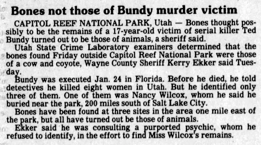 On March 19, 1989, the Deseret News reported that after Ted confessed his crimes to law enforcement they searched Capitol Reef National Park and found bones along with the tattered remnants of an old, tan blouse with lace: ‘it was deteriorated to the point that it could have been 14.5 years ago, that they say may have belonged to Nancy.’ They found bones in three different areas during a 2.5 square mile search located one mile east of the park: it was from the location Bundy confessed to dumping her body roughly two months earlier. Forensic experts felt that most of the bones belonged to animals and at the time of the discovery former Wayne County Sheriff Kerry Ekker claimed that the bones found in one area could possibly have been human and that: ‘they were of the size that alarmed us to the point that it could have been human.’ … ‘he (Bundy) claimed that he buried her, but in past victims he didn’t bury them. The information that we got on this is very vague.’…’We didn’t extricate any of the bones.’ … ‘He thought the word `Notom’ meant something to him when he left the highway.’ Sheriffs found a ‘shoulder blade that would have to be off of a small animal or a human of approximately Nancy’s size.’ Shortly after they were found the bones were sent off to be tested and unfortunately none were a match to Wilcox. The only human bone found after Ted gave his death row confessions was a patella (knee cap) in Fairview Canyon a little over 130 miles away from Capitol Reef National Park; it was assumed to have been Debra Kent’s and was given to her family. However, because investigators were unable to get DNA from the remains they were unable to 100% confirm the identification until 2015. After going through the missing persons report, it was noted that Kent’s mother had the kneecap, which authorities at the time didn’t know about. Bountiful Police Sergeant Shane Alexander said: ‘Belva Kent was very hesitant at first, but eventually she agreed, believing that it would be a good thing to know and have that confirmation. I sent the patella to the University of North Texas as well as the samples that were collected, and then they were able to determine that the patella matched the family DNA that was collected.’