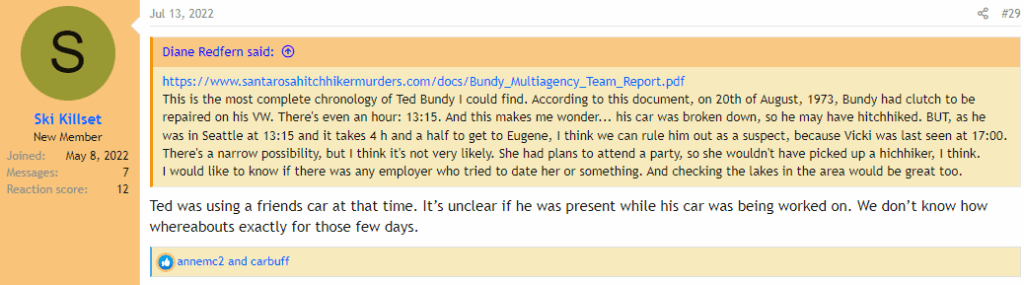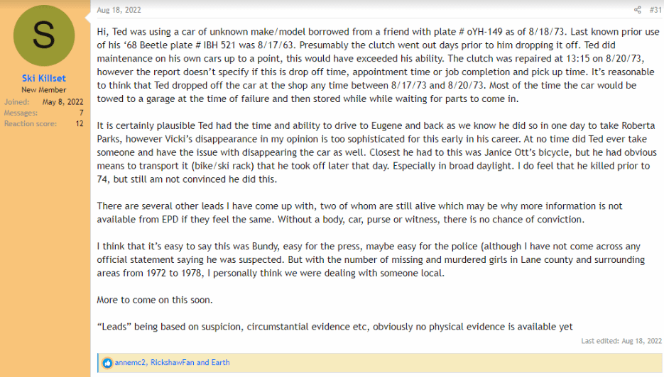 I already briefly touched on Vicki’s case when I wrote about another young girl that Bundy suspected of murdering from Oregon, Rita Jolly. Seventeen-year-old Ms. Jolly also disappeared without a trace from West Linn on June 29, 1973. At the time of Vicki’s disappearance in August 1973, Bundy seemed to be in between jobs: from February to April of that year he worked for King County Program Planning then took a break from employment until September 1973, when he was the Assistant to the Washington State Republican chairman. At this time he was still in a relationship with Liz Kloepfer and he was also enrolled in law school at the University of Puget Sound. According to the ‘Ted Bundy Multiagency Investigative Team Report 1992,’ Ted was having the clutch repaired on his VW Bug in Seattle, although it’s argued he was ‘borrowing’ a car from someone (see Websleuths screen grabs below for clarification).
