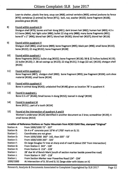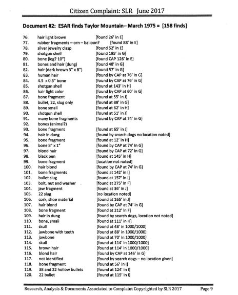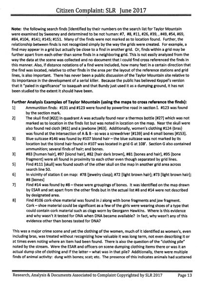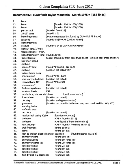 One of Sara’s more shocking revelations (for what I think are obvious reasons) is that detectives deliberately left important information out of case files, including the fact that they found ‘additional heads were found on Taylor Mountain.’ She claims the information released to her is proof that ‘158 items of evidence were found that included: skeletal remains, women’s clothing, evidence the killer spent time there; jewelry; signs of bondage and weapons (shotgun casings, gun shells, snug tie, etc) animal trails indicating animals had scattered the remains and human remains (female) who were not identified as being with the known victims there. There was also an abandoned home nearby and the ME statement states that the girls known and found there were not decapitated as has been claimed publicly. At Issaquah, there were also findings of women’s clothing, jewelry and a bicycle shift cable (labeled with a question mark). Much of this evidence was significant enough that at the time it was forwarded on to the Superior Court so why was it publicly denied? Evidence supports Sara and her contentions: her memories time and date stamped contained details which at the time the memories emerged as far back as 2001 had never been publicly released. They also contain details that are still not publicly released.’ I included the document in full below, and for this particular portion please refer to pages 12-15 of the Susan L. Roller document from cavdef.org.