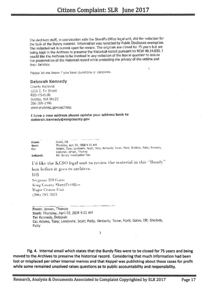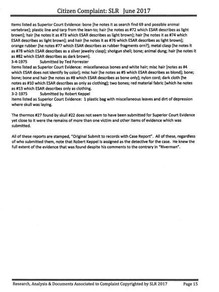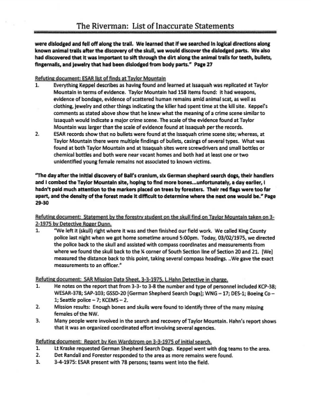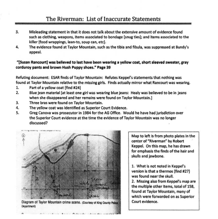 Ms. Banks points out that in Sara’s ‘memoir,’ roughly 1/3 of the text is simply a list of discovered items not properly cataloged in relation to the Bundy dump sites. Survivor claims that King County law enforcement purposefully kept this information from the community and that ‘what was put before the public for decades by Keppel and others especially early on has been incomplete, misrepresented, fabricated and blatant lies.’ This part I pulled directly from ‘Reflections on Green River’ (from the ‘table of contents’): ‘There were additional audio tapes noted in the files beyond the ones given here but they were designed ‘unplayable.’ Where are the transcripts of those tapes? What did those tapes contain in information? Why were records allowed to be held privately?’ … ‘Keppel set the tone of the case from the beginning and made sure he was the face of it but his positioning of the case was inaccurate at best and self-serving. He made every effort he could for years even after he ‘retired’ to use his connections to the justice system and to media to silence me and continue to control the case as the ‘expert’ but from what I see in the records some of his maneuverings in the case files were illegal. His statements to press were false and misleading about the case in general in WA.’ She further claims that there were many additional, never before released to the public items found at both dump sites that law enforcement never even bothered cataloging. I’m again citing Erin Banks, who very eloquently commented: ‘anyone who read Bob Keppel’s ‘The Riverman,’ knowing how meticulously the young Detective and his team combed Taylor Mountain and its surrounding area for skeletal remains and any evidence that could have been relevant to solving the case. Thousands of items were collected, thousands of items were collected thousands of callers reported their boyfriends, co-workers, family members and suspicious neighbors to the police tip line.’ Despite a massive amount of data collected from law enforcement in relation to the Bundy case that translated into a massive amount of physical documentation… Sara still claimed they (for whatever reason) purposefully left out items found at crime scenes (like skeletal human remains) in official reports. Not willing to take into account that perhaps if anything were to be missing it was more likely due to human error instead of being done purposefully. Banks also points out that ‘The Ted Task Force consisted of relatively few members. And, untoward as it may be, even investigators make mistakes, including misspelling names and losing evidence. If it looks like a duck, and quacks like a duck, it most likely is a duck.’ I’m going to have to agree with her, 100%. Sara seemed to have a particular disdain for Dr. Keppel, even going so far as to suggest or hint that he had some sort of collaborative type-relationship with Bundy, which was why certain things were left off the record.