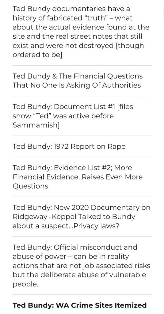 As I said earlier, I didn’t read ‘Reconstructing Sara’ (although I did notice the Amazon site said it’s available for ‘professional use only,’ but I feel I don’t quite apply) so I can’t give it any sort of review. I read through her write up in Erin Banks book multiple times when preparing for this piece, who said a good portion of what was in it could be found on her WordPress page (I included that in the works cited portion). When I first stumbled upon Sara’s story in April 2022 her website was fully operational and all of her blog posts and articles were still available (the page is also titled ‘Reconstructing Sara: The Lost Victim of Ted Bundy’). However, now (or as of May 2023) it appears that most articles have been pulled and are no longer available. When I clicked on numerous articles it took me to a page that said ‘Oops! That page can’t be found. It looks like nothing was found at this location.’ The pieces had names such as: ‘Ted Bundy Evidence Taylor Mountain: 158 items: Denied, Destroyed, Discounted for Decades,’ ‘Ted Bundy & The Public Image The Authorities Initially Created Of Him To Create Their Own ‘Super Cop’ Scenarios,’ ‘Ted Bundy & Pornography: He talked of it years before the execution,’ ‘Refuting Riverman: Doesn’t Match Original Case Files In Multiple Places,’ and ‘1989 Ted Bundy Final Confession: Was it Planned and Rehearsed?’ I wonder if this is possibly because Survivor is working on a rewrite of the book (per her Amazon page). Oddly enough, only one remains; it’s titled ‘Ted Bundy: WA Crime Sites Itemized’ and discusses how she thinks Bob Keppel purposefully tainted the Bundy investigation in Seattle and goes over the 158 items related to the Taylor Mountain evidence list. She starts it with the intro: ‘this website isn’t as much about me anymore as about justice process in the Bundy case. Keppel’s original efforts to become the face of the case suppressed important case information that should have been worked – his suppression of Bundy’s comments about Rule’s book sending it to psychiatrists instead of into evidence and suppression of Bundy’s comments about Michaud’s interview being possibly not all fact [Bundy claimed some was done by Bundy for effect] shows his willingness to protect his buddies behind the scenes and also to lessen any evidentiary probe into possible facts that were included in Bundy’s complaints [its not always just psychology – Bundy claimed Hawkins was found at Tiger Mountain with Ott and Naslund and the records appear to support that]; even the attack on me over the years as to my character was an effort to redirect any investigation away from the facts of my experiences versus what actually happened: a psychological behind the scenes gas lighting of me – no one was evaluating the correlations and facts of my experiences objectively. Keppel walked the line between ‘author’ and ‘expert’ for decades, ‘updating’ as ‘new’ what was already in evidence years earlier, using the inherent protections of both roles to cover up his original transgressions. This type of loophole in current justice system standards needs new laws.’