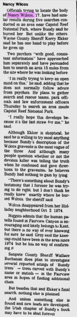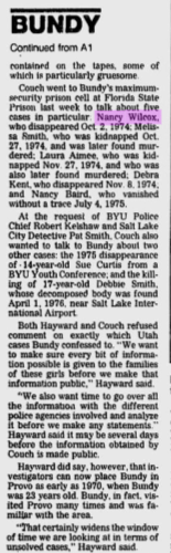 I hope I don’t need to point out that we live in different times now and back in 1974 there was no internet scroll with news constantly updating itself. Additionally, at that time police jurisdictions didn’t like to share information with one another, and Utah wasn’t on high alert like Washington state was about missing young females: Nancy was the first (known) of Bundy’s Utah victims to go missing. After Wilcox vanished, Utah law enforcement were unable to find very many helpful clues that would help them locate her (they had few leads and not much to go on). During the course of the investigation they spoke with at least 45 of her family, friends, school mates and acquaintances, however none of them knew anything about her disappearance. Several of her loved ones were also given polygraph tests but passed. On November 30, 1974, Utah police began a two day search of the canyons around Salt Lake City but were unable to find any trace of Nancy.