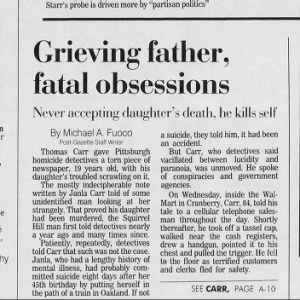 An article about the suicide of Thomas Carr published by The Pittsburgh Post-Gazette on January 30, 1998.