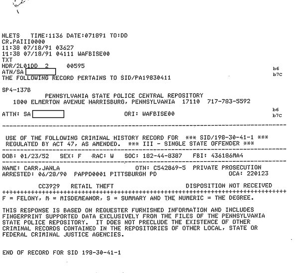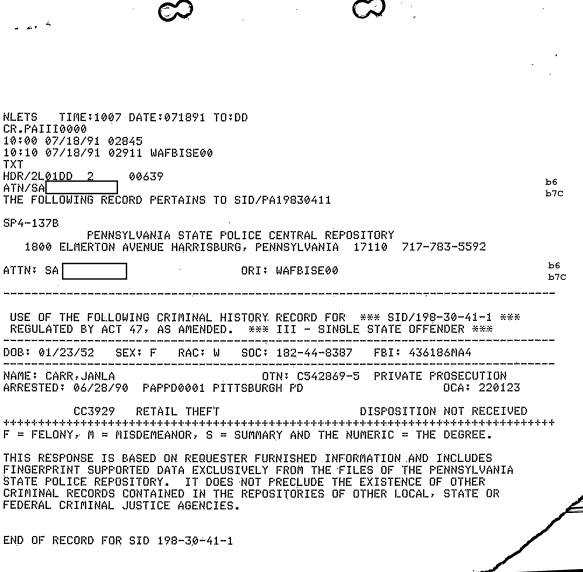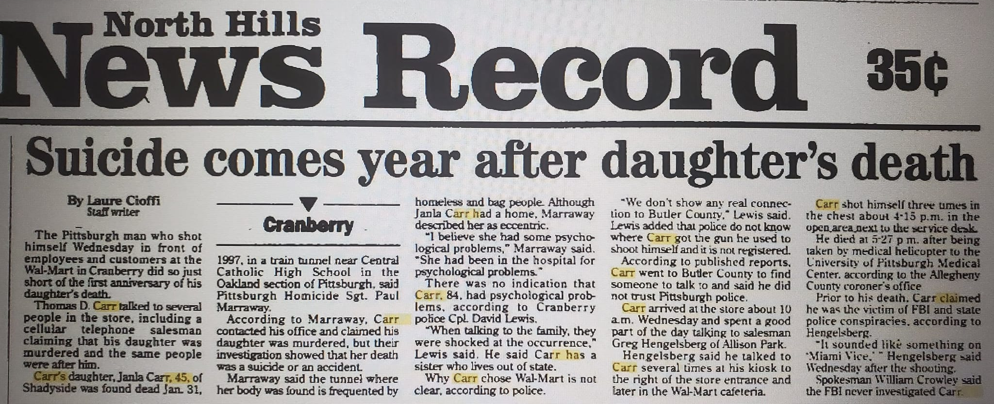 The Pittsburgh branch of the FBI looked into Janla’s story and they eventually determined that it lacked credibility (obviously, as we are all aware Bundy’s paternal lineage remains unknown). Finally Thomas Carr’s delusions of his daughter being murdered by the FBI got the best of him and he had enough: on Wednesday, January 28, 1998 Carr went to the Walmart in Cranberry, PA multiple times. He spent a few hours wandering through the isles and sharing his story with Greg Hengelsberg, a cell phone salesman working at the store. Among the things he shared was that his neighbor broke into his house and stole his stamp collection and that his phone was being tapped by the FBI and whoever is doing that also killed his daughter. Regarding the conversation, Hengelsberg commented that ‘it sounded like something on ‘Miami Vice.’’ Per an article published by the North News Record on January 30, 1998: ‘he said the same people tapping phones were the ones who killed his daughter. He said he was wanted by the FBI and the state police.’ … ‘One minute it would be a normal conversation, and then he would get serious… that they had gotten to his daughter and now were after him and whoever was tapping his phones had played it for the woman he was in love with and and she had duped him and never spoke to him again.’ When he was finished walking the store, Carr took off the tasseled hat he was wearing, walked near the cash registers, pulled out a handgun, pointed it to his chest and pulled the trigger. Clearly hurt, he quickly fired two more shots into his chest; he died later that day. The day before he took his life, Thomas went to the Butler Eagle Newspaper offices and told a member of their staff that he wanted to talk about his daughter’s death. He said that he wanted to talk about his attempts to get the Pittsburgh Police interested in the case but he no longer felt he could trust them. He also said that he was ‘on the run from the law’ and that Janla’s murder involved a top political aide of a gubernatorial candidate. He was referred to Post-Gazette reporter Dennis B. Roddy. According to one-time Cranberry Police Corporal David Lewis, Carr showed no signs of having any psychological problems, and when his family was contacted they were surprised at the news. Lewis further commented that police didn’t know how Carr obtained the gun used to shoot himself and that it’s not registered.