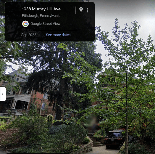 Thomas Carr’s address of 1038 Murray Hill Road in Pittsburgh, PA. It’s the house to the right and the view is obscured due to trees.
