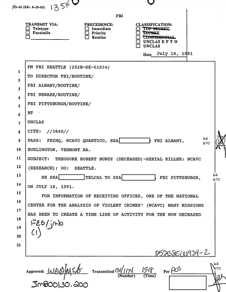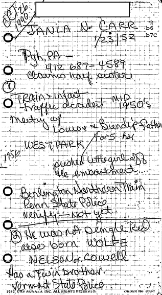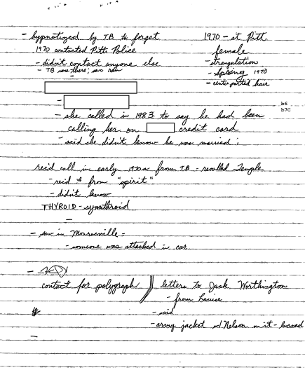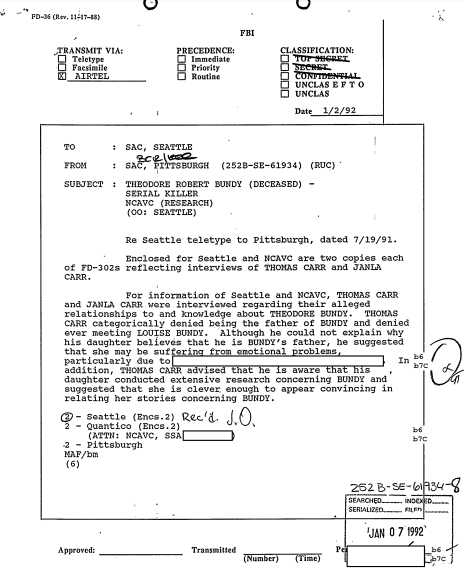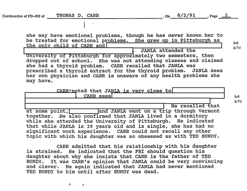 Thomas Carr first remembers his daughter talking about Bundy for the first time at some point in the late 1980’s: he told the FBI that she called someone in Washington about Ted and that he tried to discourage her from doing it again. Thanks to these documents released by the FBI, we know that Janla didn’t begin her delusions of Bundy being her half-brother until around 1990, and she first contacted Seattle law enforcement that September about her speculations (conveniently this was after he was executed in January 1989). Carr told them she wanted to help provide information about his involvement in ‘several homicides.’ At some point in 1991, Ms. Carr learned that Louise Bundy named Jack Worthington as Ted’s father, which per the document ‘relates Janla’s claim that her father told Louise his name was either Lloyd Nelson or Jack Worthington.’ Unfortunately the (handwritten) notes aren’t completely clear (to me, anyways) and it’s tough deciphering what is meant in some parts. It appears Janla attempted to contact the agency multiple times and they finally granted her an interview on October 26, 1990, when she shared with them her alleged past experiences with Ted Bundy (she even offered to undergo a polygraph examination proving she was being truthful). Carr claims Ted was given the surname Wolfe, Nelson, or Cowell at birth and that her Dad ‘thinks she’s nuts’ and that her ‘stories are fabrications.’ Thomas Carr commented that he ‘could not recall any other topic with which his daughter was so obsessed as with Ted Bundy.’ (Fun side note: she also claimed he had two toes that were stuck together).
