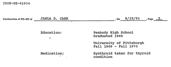 It shouldn’t come as a surprise that Janla had a long history of mental illness: her father claims that she never held a job and he paid the rent for her apartment (located in an old mansion at 5705 Fifth Avenue in the Oakland area of Pittsburgh). Even though Thomas said she didn’t work a company called ‘Telefundraiser / Public Interest Communications’ is listed in the FBI document as Janla’s place of employment with a notation of of April 1990 written by it (I don’t know if they meant that was her current POE and started that April or if it was the only place she’s ever worked, it’s not clear). She also had numerous inpatient stays at the Western Psychiatric Institute and Clinic in Pittsburgh. Her father also shared with the FBI that his daughter also had some sort of ‘thyroid condition‘ and took ‘Synthroid,’ a Doctor prescribed thyroid medication that is used to treat a condition called hypothyroidism in adults and children. It is meant to replace a hormone that is usually made by an under-producing thyroid gland. Looking into the condition, it appears that individuals suffering with this thyroid disease often experience changes in mood, specifically anxiety and depression. It seems that the more advanced the thyroid condition, the more severe the mood shifts.
