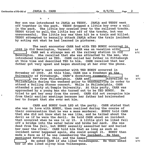 Page six of a document regarding Janla Carr/Ted Bundy from vault.fbi.gov.