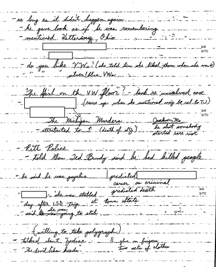 Interestingly enough, Ms. Carrs run-ins with Ted didn’t end when they were children (it actually seems as if the encounters happened more frequently when the two were adults). Janla told the Pittsburgh branch of the FBI that the next time she saw her half-brother was while on vacation in Vermont in 1968: she ‘met a strange man at the railroad station’ in Old Bennington who introduced himself to her as Ted and that she was attracted to him. When she called her Dad and told him about her new friend he became very angry and started yelling at her. After that Carr claimed that she ran into Ted at a Rolling Stones concert in Philadelphia (sometime between 1968 and 1970) while he was attending Temple University and living at his Aunt Julia’s house in Lafayette Hill. It’s worth noting that Bundy did briefly live in Pennsylvania from December 1968 until May 1969 when he moved back to Tacoma (per the ‘TB FBI Multiagency Report 1992.’). Next up: at some point in November 1969 Carr said they ran into each other at a party shortly when she was a freshman at the University of Pittsburgh. She claimed that she didn’t recognize him because at some point in the past her father and Ted hypnotized and brainwashed her (I’ll elaborate more on that later). The two took LSD together while at the party and determined then that she was ‘in love with him’ despite him confessing to her that he was a ‘mass murderer.’ Bundy told Carr that she didn’t know what he was really like, and he talked about ‘the devil as if he were the devil.’ During that trip he started disclosing all of his deepest, darkest secrets to her, including the fact that he already committed several murders at that point in time (even though he told Bob Keppel that he started killing women in 1972) and that one time he incited a race riot after he shot a man in Jackson, Mississippi (you know, because he was known to do that), which ‘bears certain Manson-esque connotations’ (Banks, 54). Carr also claims that Ted confessed to being responsible for the 1969 slayings of Elizabeth Davis and Susan Curtis (also known as the Jersey Parkway Murders). I do want to note, the FBI file said that Ted shared with Janla that he was responsible for A murder on the Jersey Parkway (as in one).. and I don’t know if this is an error or intentional. In her book, Banks points out that ‘Bundy had allegedly intimated to Dr. Ron Holmes that he had killed the two women, yet no recording of it exists. It is noteworthy that Bundy was incarcerated with Gerald Stano at the time, who was a suspect in the case and may have filled Bundy in on several details of the double homicide.’ Carr claims that Ted confessed to a series of murders that was discussed in the book, ‘The Michigan Murders’ as well as some slayings in Ohio. Additionally (although he didn’t give the victims name), she claimed that Ted took responsibility for the disappearance of eight year old Ann Marie Burr from his hometown of Tacoma, WA. Carr claimed that Ted described pushing the little girl off a bridge which resulted in her neck breaking. After she was dead, the fifteen year old sexually assaulted her before he buried ‘her body near a river.’ After this encounter, Bundy hypnotized Janla so she would forget the encounter ever happened.