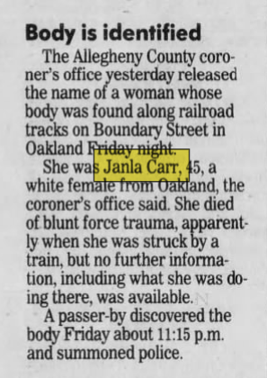An article about Janla Carr’s death published by The Pittsburgh Post-Gazette on February 3, 1997.