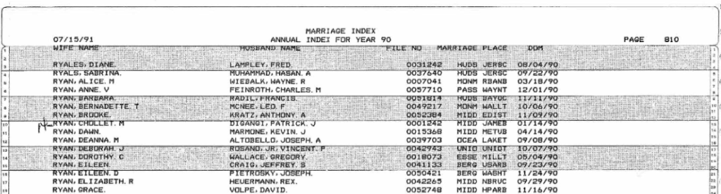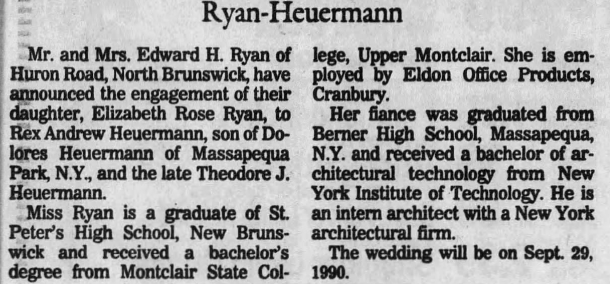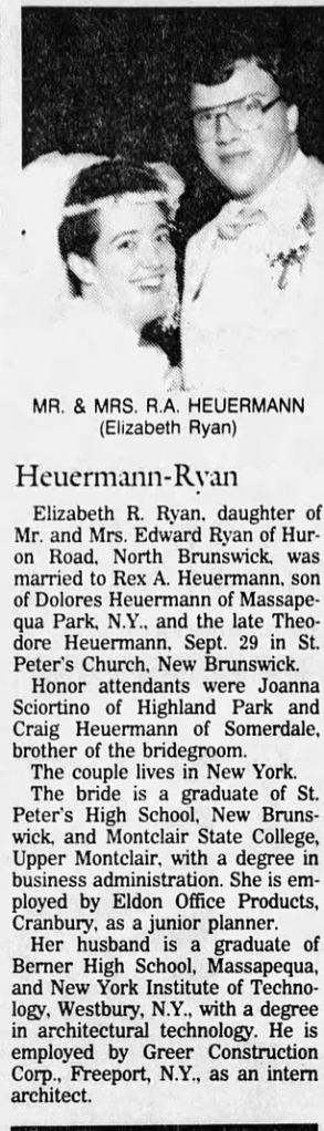 Rex’s sister Phyllis’s senior picture in the 1977 Berner High School yearbook.Rex Heuermann in a group photo for The Drama Club from the 1980 Berner High School yearbook.Rex Heuermann’s senior picture from the 1981 Berner High School yearbook.Rex Heuermann in a group photo for The Drama Club from the 1981 Berner High School yearbook.A clipping about Rex and his first wife Elizabeth’s engagement published in The Central New Jersey Home News on August 20, 1989.The wedding announcement for Rex and Elizabeth published by The Central New Jersey Home News on October 28, 1990.Twenty-six year old Rex and his first wife Elizabeth on their wedding day in New Brunswick in 1990. At the time of their nuptials Elizabeth was employed as a junior planner at an office supply company in New Jersey, while Heuermann was an intern at an architectural firm. The couple settled down in Long Island, New York.Rex and Elizabeth on a marriage index from 1991.Rex Heuermann has an adult daughter named Victoria, who graduated with a Bachelor of Fine Arts in 2019. Victoria Heuermann.Rex Heuermann’s second wife Asa Ellerup, who was by his side in court when he plead not guilty to murder charges on July 14, 2023.Another picture of Asa Ellerup.Rex in a picture he used on a dating app. Heuermann buying additional minutes in cash for another burner cellphone in May 2023.Just some of the Google searches done on Heuermann’s computer.More Google searches done on Heuermann’s computer.A Google Maps view of Gilgo Beach.An aerial view of Gilgo Beach.The garbage can police found the pizza box in January 2023. The discarded pizza box collected by police in January 2023. Rex Heuermann’s house in Massapequa Park, NY.One of Rex Heuermann’s July 2023 mugshots.Another one of Rex Heuermann’s July 2023 mugshots.Maureen Brainard-Barnes, one of Heuermann’s first four victims that was found a decade ago near Gilgo Beach. Another one of Heuermann’s first victims, Melissa Barthelemy. My younger sister went to high school with her in Alden, NY.Megan Waterman.Amber Lynn Costello.Valerie Mack, another suspected victim of Heuermann. In September 2000 her partial remains were found in a wooded area in Manorville, NY.Jessica Taylor, who worked as an escort in New York City. Her partial skeletal remains were located in a wooded area in Manorville, NY on July 26, 2003.On April 4, 2011 the remains of an Asian male were discovered along Ocean Parkway in Brooklyn, NY. Law enforcement strongly speculate it was a transgender sex worker that had been dead for up to five years.A forensic sketch of the of the transgender victim.A breakdown of where the victims bodies were found along Gilgo Beach.An article listing Heuermann’s address (at the bottom of the first row) published by Newsday on January 17, 1999.An article mentioning Heuermann published in The Daily News on September 13, 2007.