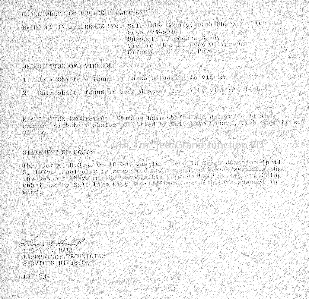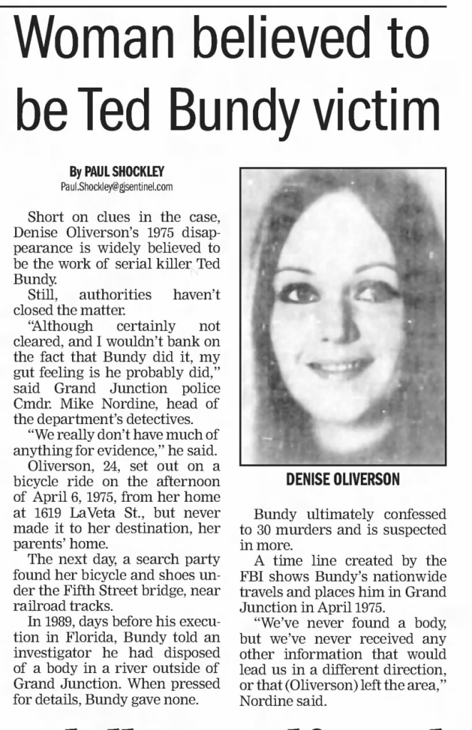 Denise’s sophomore year picture from the 1966 Grand Junction High School yearbook.Denise’s junior year picture from the 1967 Grand Junction High School yearbook.Denise’s senior year picture from the 1968 Grand Junction High School yearbook.Denise Oliverson.Denise Oliverson.Oliverson and an ex-boyfriend. Photo courtesy of the Grand Junction PD.Some photography negatives of Denise. Courtesy of Captain Borax.Denise Oliverson on her wedding day.Oliverson’s mug shot after she was arrested in 1969 in Grand Junction for a misdemeanor after being caught with marijuana.A missing persons bulletin for Oliverson. Photo courtesy of the Grand Junction PD. A missing persons bulletin for Oliverson. Photo courtesy of the Grand Junction PD/Tiffany Jean.Oliversons wooden clogs that were found near the 5th Street viaduct close to her yellow bike. Photo courtesy of Captain Borax.The bottom of the pair of Oliversons sandals that were collected at the abduction site. Photo courtesy of Captain Borax.Oliversons underwear that were collected at the abduction site. Photo courtesy of Captain Borax.Denise and Joe’s engagement announcement published in The Daily Sentinel on May 20, 1970.Denise and Joe’s wedding announcement published in The Daily Sentinel on September 30, 1970.An article about Joe Oliverson visiting with his family published by The Herald-Journal on February 16, 1972.An article about Oliverson missing published by The Daily Sentinel on June 24, 1975.An article about the disappearance of Denise Oliverson published by The Daily Sentinel on October 13, 1975.An article about the disappearance of Denise Oliverson published by The High Point Enterprise on October 26, 1975.An article mentioning Denise Oliverson published by The Greeley Daily Tribune on October 27, 1975.An article mentioning the disappearance of Denise Oliverson published by The Greeley Daily Tribune on October 31, 1975.Oliverson is briefly mentioned in an article about Bundy’s victims published by The News-Press on June 26, 1979.An article about the disappearance of Denise Oliverson published by The Daily Sentinel on The Daily Sentinel on July 22, 1979.Oliverson is briefly mentioned in an article about Bundy’s victims published by The Spokesman-Review on August 22, 1979.Oliverson included in a list of Bundy’s victims published in The Tallahassee Democrat on October 2, 1980.Part one of article about the disappearance of Denise Oliverson published by The Daily Sentinel on February 23, 1986.Part two of article about the disappearance of Denise Oliverson published by The Daily Sentinel on February 23, 1986.Oliverson is mentioned in an list of Bundy’s confirmed victims published by The St. Petersburg Times on July 8, 1986.A poor quality picture of an article mentioning Oliverson that was written right before Bundy was executed. Published by The Standard-Examiner on January 27, 1989.An article about Bundy being executed that mentions Denise at the very bottom published by The Tribune on January 27, 1989.Oliverson is briefly mentioned in an article written about Bundy’s victims published by The Waycross Journal-Herald on January 28, 1989.An article about the disappearance of Denise Oliverson published by The Daily Sentinel on January 31, 1989.A picture of Denise Oliverson from the first part of an article published by The Daily Sentinel on May 29, 2011.Part two of an article published by The Daily Sentinel on May 29, 2011.A blurb about Oliverson published by The Windsor Beacon on February 17, 2019.Three retired investigators that worked Oliversons case. From left: Ron Smith, James Fromm, and Doug Rushing.Oliversons one bedroom residence located at 1619 LaVeta Street; she lived here with her boyfriend, Steve Romero. Photo courtesy of OddStops.Oliversons mailbox, at 1619 LaVeta Street.The inside of Denise’s house on LaVeta Street as it looks today.The inside of Denise’s house on LaVeta Street as it looks today.The inside of Denise’s house on LaVeta Street as it looks today.The side yard of Denise’s house on LaVeta Street as it looks today.Robert and Nina Nicholsons home, located at 801 Ouray Ave in Grand Junction. Photo courtesy of Google Maps.A bike ride from Denise’s residence to her parents house should have taken 20 minutes. A route from Denise’s house to Lincoln Park to her parents house should have taken her a little over 25 minutes. A possible route Bundy make have taken to the South 5th Street bridge n Grand Junction, Colorado.Bundys whereabouts on April 5, 1975 when Oliverson disappeared according to the ‘TB Multiagency Investigative Team Report 1992.’The former Chevron station where Bundy filled up the day he abducted and murdered Denise in Grand Junction.Denise and her husband listed in the Grand Junction City Directory in 1971.Joe and Denise Oliverson’s marriage certificate from September, 1970.Excerpts from Denise’s journal. Photo courtesy of the Grand Junction PD.Excerpts from Denise’s journal. Photo courtesy of the Grand Junction PD/Tiffany Jean.A letter to Denise from her counselor, Lois Kanaly. Photo courtesy of the Grand Junction PD/Tiffany Jean.A letter from Steve Romero to Denise’s sister, Renee. Photo courtesy of Captain Borax and The Grand Junction Police Department.Documentation related to Denise’s missing persons case from the Grand Junction PD. Photo courtesy of Captain Borax.Documentation that Denise’s property was checked into evidence at the Grand Junction PD. Photo courtesy of Captain Borax.A letter from the Grand Junction Chief of Police to Pitkin County Sheriff asking for assistance. Photo courtesy of the Grand Junction PD/Tiffany Jean.A letter dated February 19, 1976 from FBI forensics lab confirming receipt of Oliverson’s hair samples for comparison to evidence taken from Bundy’s car. Photo courtesy Grand Junction PD/Tiffany Jean.Some of Denise’s artwork. Photo courtesy of Captain Borax.A notation regarding Bundy’s Chevron receipts.Hand drawn map that came wit