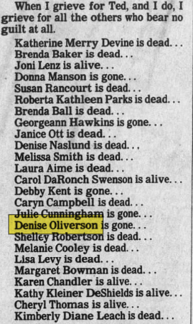 In the same conversation Ted also volunteered that he abducted Susan Curtis from BYU on June 27, 1975 and gave investigators information as to where they would be able to find her body. Gas receipts placed Bundy in Grand Junction on the day that Denise disappeared: he put $3.16 in fuel at a gas station in Grand Junction on his Chevron card right before he abducted her. That same credit card was used to pay for fuel in Aspen and Vail on days his other victims Caryn Campbell and Julie Cunningham (respectively) were abducted as well. It was FBI agent Bill Hagmaier that Bundy confessed his total kill count to: eleven young women in Washington state, eight in Utah, three each in Colorado and Florida, two each in Idaho and Oregon, and one in California. The Oliverson family found out with the rest of the world that their daughter was murdered by the serial killer: they heard it on the news after he was executed.