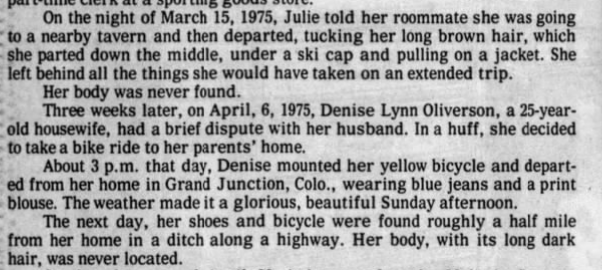 On May 28, 1975 law enforcement sat down with Steve Romero, who volunteered that by that date in time Denise had been missing for 52 days. He told investigators that the afternoon she vanished they had gone to a local park and he witnessed her acknowledge a man that he didn’t know and became upset when he refused to talk to her. Oliverson appeared to have developed feelings for this individual, as she became visibly upset when she learned he had gotten married. At one point in the past the two apparently had a sexual relationship, but I don’t know if it went beyond that or if they dated at all. Romero said when they were done at the park (I’m not sure if they were walking or biking) they moved onto exploring the downtown area of Grand Junction before returning home. After the couple got home from their excursion Denise told Romero that she was going out for a bicycle ride and was going to stop at her parents house before coming home; He said it was the last time he ever saw her alive.