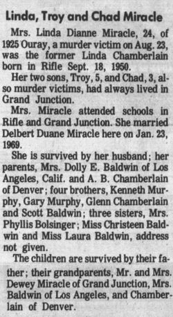 Dubbed by locals as ‘The Year of Fear,’ 1975 was a rough period for Grand Junction when it came to missing and murdered women: in addition to Oliverson, on July 28 twenty-four year old Linda Benson and her five year old daughter Kellie were brutally murdered in their residence at the Chateau Apartments. Just as a (strange) side note, according to the website cavdef.org, there is also a possibility that Bundy was present when the young mom and her child were killed: when a neighbor of Benson named Steve Goad saw him on TV after he was arrested in August 1975 he recognized him as a man that was in the apartment complex’s parking lot the evening Benson was murdered. In 2009 DNA linked serial rapist Jerry Nemnich to their murders. Strangely enough, she was friends with another Grand Junction woman that got murdered on August 23 in 1975: Linda Miracle. Twenty-four year old Miracle and her two young sons were killed by a neighbor, Ken Botham Jr. after he killed his wife at the home they shared. On December 27, Deborah Kathleen Tomlinson (not to be confused with Deborah Lee Tomlinson, who disappeared with a friend on her 16th birthday in October 1973 from Creswell, Oregon) was killed in her apartment complex in the 1000 block of Belford Avenue in GJ. She was found lying partially nude in her bathtub and had been sexually assaulted, bound and strangled. In December 2020 using DNA technology investigators identified Jimmie Dean Duncan as the man who killed Tomlinson.