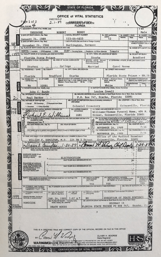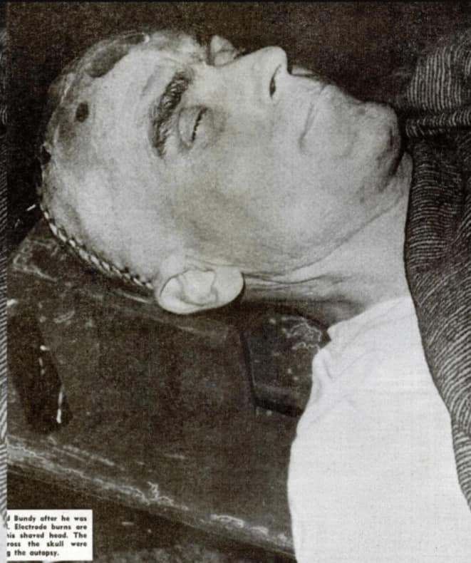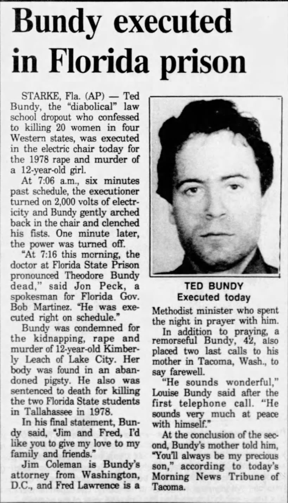 Bundy in prison with some of his fellow inmates. Photo courtesy of Supernaught.Ol’ Sparky, the electric chair at Florida State Prison. Bundy peering out from behind the bars at Florida State before he was executed. Photo courtesy of Hezakya News.A drawing of Bundy walking to the execution chair. A drawing of Bundy on his way to the execution chair. A drawing of Bundy in the execution chair. Photo courtesy of ‘Ted Bundy: I was Trying to Think like an Elk.’ A drawing of Ted sitting in the electric chair.A picture from a Florida newspaper after Bundy was executed.The crowd outside of Florida State Prison before Bundy’s execution in the early morning hours of January 24, 1989. Photo courtesy of Fox 13 News.The crowd outside of Florida State Prison before Bundy’s execution in the early morning hours of January 24, 1989. Photo courtesy of Fox 13 News.News crews gathering outside of Florida State Prison before Bundy’s execution in the early morning hours of January 24, 1989. Photo courtesy of Hezakya News.A gentleman wearing a ‘Burn Bundy, Burn’ t-shirt outside Florida State Prison before Bundy was executed. Photo courtesy of Hezakya News.A picture taken the morning of Bundy’s execution.A picture taken the morning of Bundy’s execution.A picture taken the morning of Bundy’s execution.A picture taken the morning of Bundy’s execution.A picture taken the morning of Bundy’s execution outside Florida State Prison.A sign someone was holding outside Florida State Prison before Bundy was executed. Photo courtesy of Fox 13 News.A sign someone was holding outside Florida State Prison before Bundy was executed. Photo courtesy of Fox 13 News.A sign someone was holding outside Florida State Prison before Bundy was executed. A picture taken before Bundy’s execution.Some pro-death penalty demonstrators standing outside of Florida State Prison the morning of Ted’s execution.Some anti-death penalty protesters standing outside of Florida State Prison the morning of Ted’s execution.Some anti-death penalty protesters standing outside of Florida State Prison the morning of Ted’s execution.A sign hung in the window of a Florida musical instrument store the morning of Bundy’s execution.A sign hung in the window of The Phyrst, a bar in Florida on the morning of Bundy’s execution. Mrs. Bundy talking on the phone the morning of Ted’s execution. The hearse pulling out of Florida State Prison carrying Bundy’s remains after he was executed.The hearse driving Ted’s remains to the ME’s office after he was executed.A photo of Ted arriving at the Medical Examiners office after his execution.A B&W of Bundy after his execution.A close-up B&W of Bundy after his execution.A picture of Bundy, post-mortem. Photo courtesy of the Florida state Department of Corrections.Bundy after his execution.The top of Bundy’s head after his execution.Bundy’s legs after his execution.An article written the day Bundy was executed published by The Greenwood Commonwealth on January 24, 1989.An article written the day Bundy was executed published by The Enterprise-Journal on January 24, 1989.An article written the day Bundy was executed published by The Elizabethton Star on January 24, 1989.An article written the day Bundy was executed published by The Sun Times on January 24, 1989.Bundys death certificate. A mock obituary for Ted Bundy created by ‘theodorerobertcowellnelsonbundy.wordpress.com.’ The description reads: ‘I thought he deserved a proper obituary, not some sensationalized news article about the monstrous serial killer celebrating his death.’ An interesting opinion piece Bryan Kohberger’s mother sent to a newspaper about Ted Bundy’s execution, published by The Daily News on February 16, 1989.