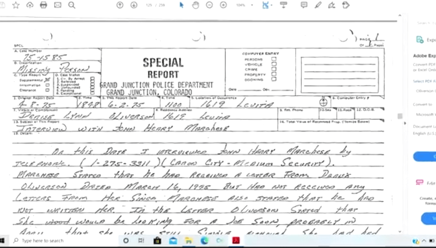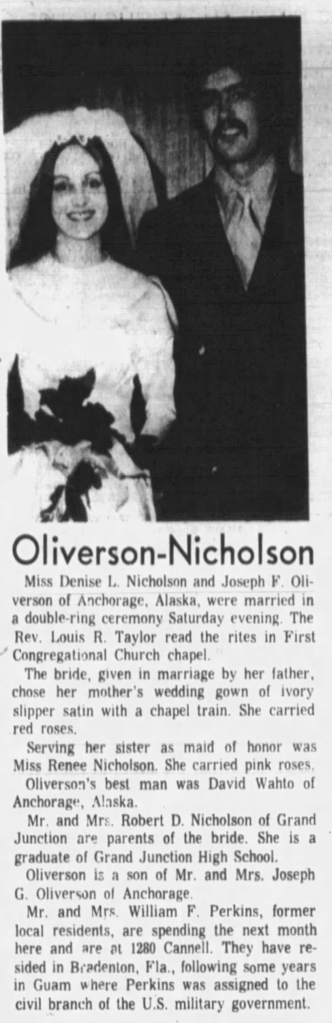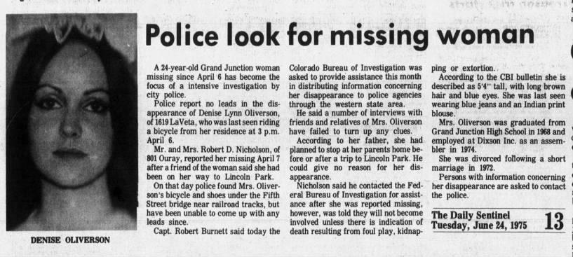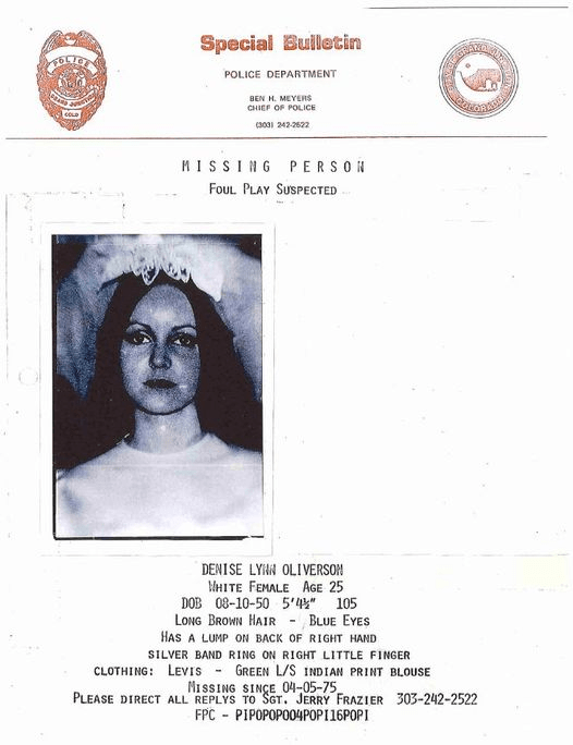 Joe Oliverson sat down with Grand Junction law enforcement on May 29, 1975 to go over some details about his ex-wife’s disappearance.He shared that he married Denise in late September 1970 but had divorced her by mid-March 1972; he remarried shortly after it was finalized. In April 1975, Oliverson was employed at a company called Steel Fabricating and the last time he had heard from Denise was about a year prior. He said after their split she always seemed to be in some sort of relationship and always appeared to have a boyfriend, and he knew that she was seeing a guy from either Portland or Seattle but wasn’t sure if he was ever told his name.Joe knew that his ex-wife had a few close friends in Grand Junction and was incredibly trusting, almost to the point of being gullible. He also said that she was a very independent person and was exactly the type that would ‘just take off’ (which strangely enough is the exact opposite of what her friend said about her).