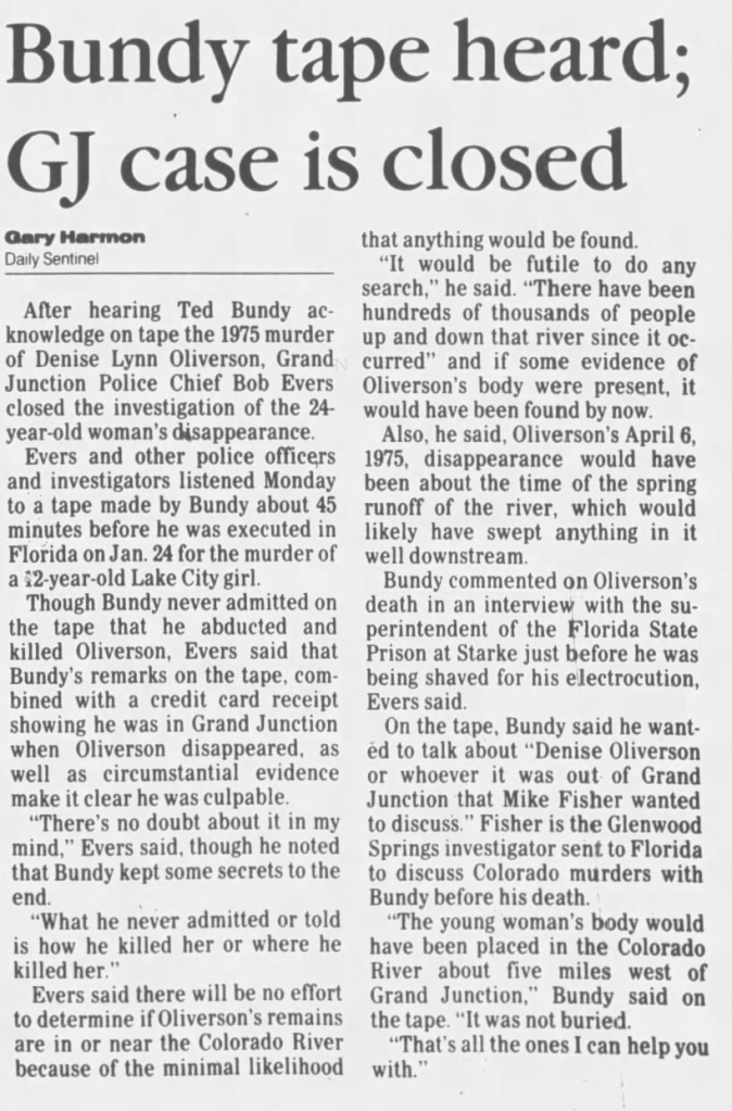 The following is the transcript of a recording by Bundy regarding Denise Oliverson, dated the day of his death on January 24, 1989 at Florida State Prison; it took place in a five minute conversation roughly 45 minutes before his execution: ‘To the ah… Mike Fisher and the, the Colorado detectives ah… the last girl they wanted to talk about, Denise Oliverson, I believe, I’m not sure… out of Grand Junction that Mike Fisher wanted to discuss… ah, I believe that the date was in April 1975. Ah… the young woman’s body would have been placed in the Colorado River about five miles west of Grand Junction. It was not buried. That’s all the uh… the ones that I can help you with… it’s all the ones that I know about that uh… no missing ones outstanding that we haven’t talked about.’