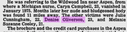 On May 29, 1975, Grand Junction investigators sat down with another one of Oliversons friends Lynn Kaufman, who shared that on occasion Denise would take off for a while but always came back after a few days. She said at the very least she would contact her mother to let her know she was ok. When asked if she knew where Oliverson might have gone to she replied that she didn’t know why but thought it possible that she may have wound up in California, and she had been there once before and enjoyed it there. Kaufman also said that she never learned how to drive and didn’t have a driver’s license.