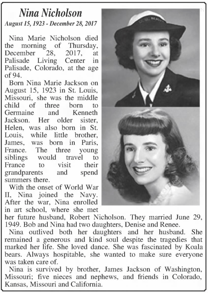 Denise Lynn Oliverson (née Nicholson) was born on August 10, 1950 to Robert ‘Bob’ Dale and Nina Marie (nee Jackson) Nicholson in Missouri.Mr. Nicholson was born on June 12, 1927 in Saint Joseph, MO and served in the US Navy during WWII. Denise’s mother was born in St. Louis, Missouri on August 15, 1923 and after graduating from high school enlisted in the US Navy. When the war ended, Nina enrolled at Denver Art Institute, where she met her future husband. The twogot married on June 29, 1949 and had two daughters: Denise and her younger sister, Renee. The couple eventually relocated to Colorado and Robert got a job as a commercial artist at The Daily Sentinel. The family settled down in Grand Junction in 1963 after moving from Colorado Springs; after Denise was murdered Mr. Nicholson said he regretted moving there and said that it was ‘a mistake.’
