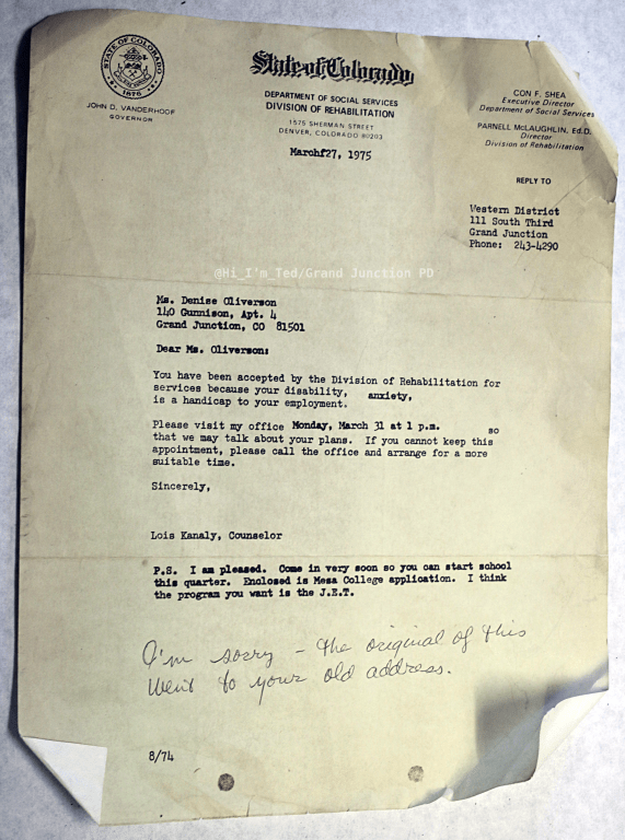 In 1969 Denise was charged with a misdemeanor after being arrested in GJ for marijuana possession, and at some point in the early 1970’s she lived in Spokane, WA with an individual named JC Harrison. Described by her friends and loved ones as being a ‘great, kind person,’ she married Joseph Franklin Oliverson on September 26, 1970. Joe was born in March 1950 in Idaho but his family relocated to Alaska; he was a 1968 graduate of Dimond High School in Anchorage, where he grew up. Oliverson attended Mesa College and when the couple first got married he was employed in Alaska; he eventually relocated to Grand Junction to be with his wife and got a job in insurance and real estate. After going through a rough patch the couple divorced on March 13, 1972. When she was killed Denise was in a new relationship with a man named Raymundo Esteban Romero (who simply went by ‘Steve’). According to her dad, Denise was a frequent drug user and in the early stages of her disappearance he suspected that she may have imbibed in some sort of illegal substances and taken off. Despite a history of running away (she would always return after a few days), Oliversons history in the year prior to her disappearance hinted that she changed a lot and didn’t participate in that behavior anymore. In a letter to Denise dated March 27, 1975 sent from her behavioral health counselor, Lois Kanaly shared that the young divorcee was accepted by the Division of Rehabilitation for services because of her disability, andher anxiety diagnosis was considered ‘a handicap to her employment.’ From there, the letter stated that she had an upcoming therapy appointment on March 31 at 1 PM. At the bottom was a postscript that read: ‘I am pleased. Come in very soon as you can start school this quarter. Enclosed is the Mesa College application.’ Kanaly also advised Denise to look into the schools J.E.T. program. So, obviously Oliverson was in the process of making some big changes in her life, and seemed to be in the process of applying to go to college.