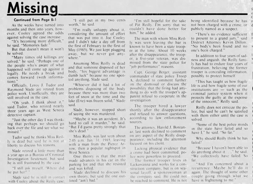 Retired West Seneca Detective Raymond Slade told the media that even though they lacked evidence he fully believed that Reilly had been murdered the night she disappeared and her killer had managed to successfully dispose of her body in a still unknown location. By July of 1985 investigators were still unable to find any real physical evidence in relation to what may have happened to her, and despite hundreds of hours spent investigating the case, they were unable to produce any solid leads in relation to the missing woman. Since Reilly disappeared, West Seneca police have interviewed and polygraphed over 200 of her friends, family, acquaintances, and coworkers, and unfortunately it didn’t result in much helpful information that aided them in their investigation. Police even met with a self-proclaimed psychic from New Jersey, who had reportedly been helpful in other missing persons investigations. In the weeks after she vanished, Detective Tyzcka said the department spent hundreds of combined man hours searching wooded areas, dumpsters, bodies of water, and fields for any trace of her remains. In an interview before his retirement Tyzcka also said that the inability of LE to find the young woman’s body was one of the ‘most frustrating mysteries of his career.’